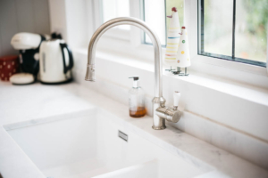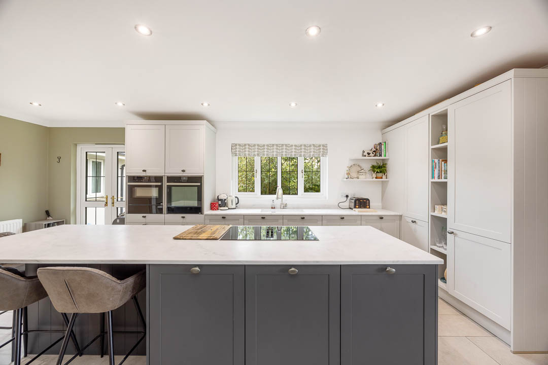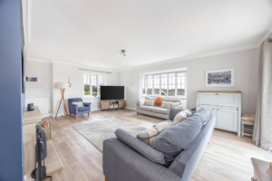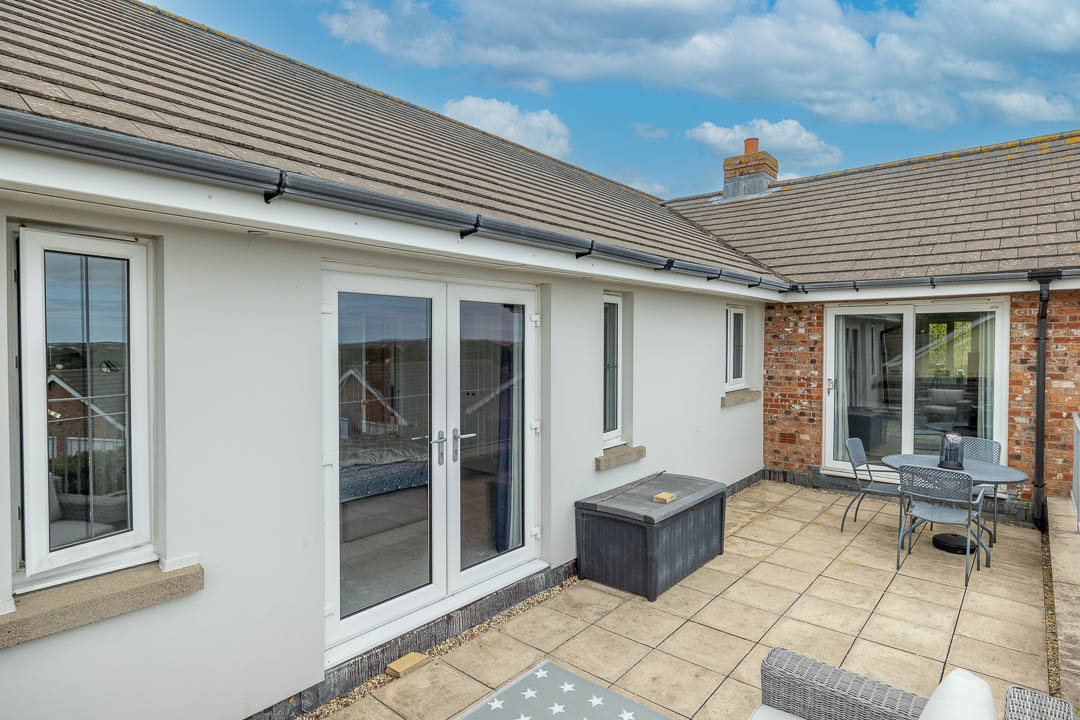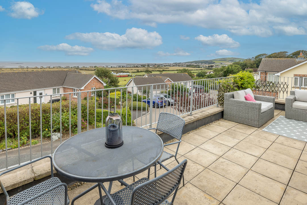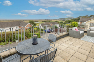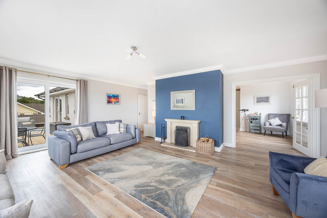 On the first floor there is a double glazed window over the stairwell offering plenty of natural light throughout the hallway. Off the hallway there is a door into a fantastic sized living room with dual aspect double glazed windows and sliding patio doors that lead out to sun terrace which enjoys panoramic sea and countryside views. The lounge features an open-fireplace with a stone surround and tiled hearth, and wood effect flooring that continues through to the excellently sized open-plan kitchen and dining area. The dining area has a window to the side aspect looking across the gardens and surrounding countryside. A large opening leads into the kitchen which has been recently modernised with soft grey base, wall and drawer units with marble worktops, a large central island with contrasting units and breakfast bar. Integrated appliances which include NEFF induction hob, double combi ovens (one with slide and hide door), plate warmer, fridge freezer and dishwasher. A set of French patio doors provide access out to the rear garden and a large double glazed window offers plenty of natural light. Off the kitchen is access into the utility room which is fitted with matching base units, large built in cupboard housing the pressurised hot water cylinder from the air source heat pump and space and plumbing for a washing machine, tumble dryer and space for an additional under counter fridge. Off the hallway there is a large guest cloakroom fitted with a wash hand basin and WC, and a large built in airing cupboard off the hall. Bedroom 1 and 2 are situated on the first floor, Bedroom 1 is situated to the front of the property enjoying panoramic views out to sea and access onto the private sun terrace via a set of double glazed French patio doors, dual aspect windows offer plenty of natural light and a bank of fitted wardrobes to one wall. In addition to the fitted wardrobes there is a walk through wardrobe which is fitted with two double wardrobes, one to either side, and then leads through to the en-suite bathroom which has been recently modernised and fitted with a double ended bath, wet room style shower, wash hand basin with vanity unit below and WC, tiled floors, underfloor heating and part tiled walls. Bedroom 2 is a large suite with a fitted wardrobe, dual aspect windows and an en-suite shower room fitted with a walk in shower, wash hand basin and WC