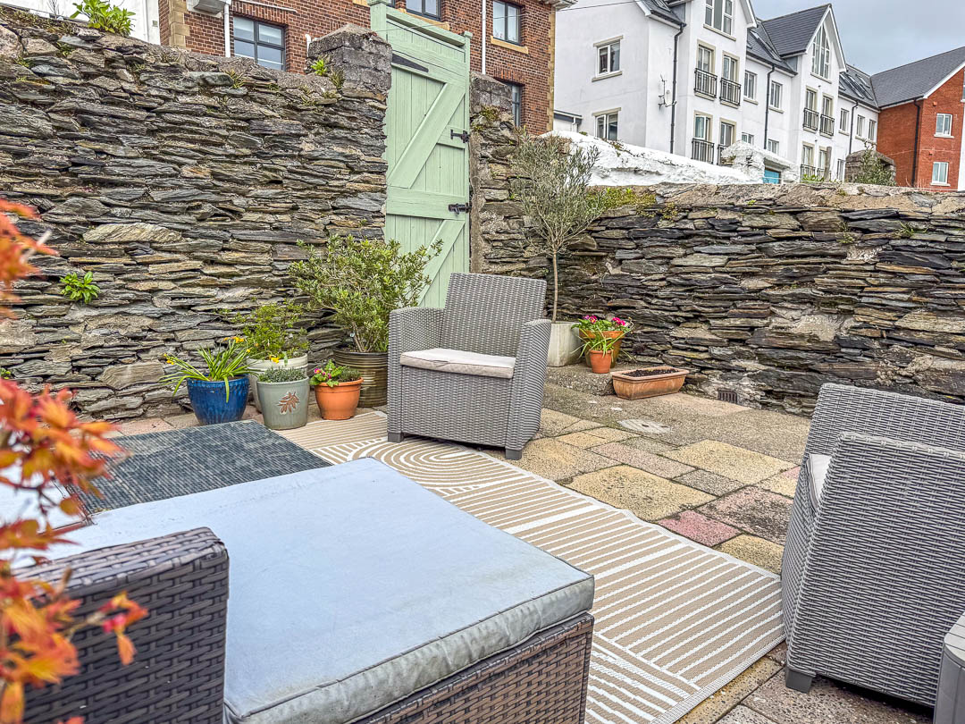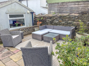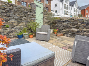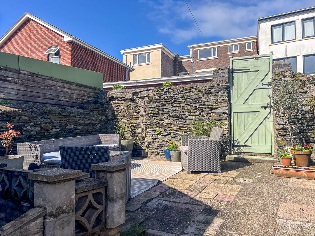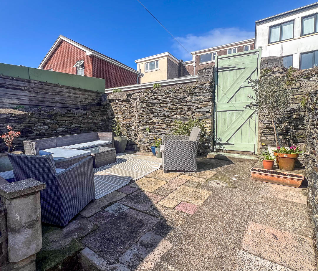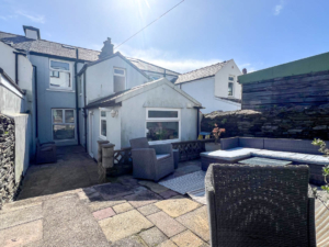 To the rear of the property there is an l-shaped courtyard garden with patio slabs directly off the back of the house, and then steps leadings up to a raised courtyard area with exposed Manx stone walls. Timber gate providing access to the rear land.