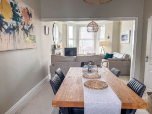 To the front there are steps leading to the front door and a raised patio garden. Entering the property via the double glazed door which leads into the vestibule porch with access through to the entrance hall. The entrance hall has tile effect flooring, carpeted stairs leading up to the 1st floor and original coving and period features throughout, understairs storage cupboard. Off the entrance hall, there are two doors, one leads into the bay fronted lounge and the other into the dining room. Both rooms are open to each other, offering plenty of natural light, dual aspect double glazed windows, including a large bay window to the front. Feature electric fireplace to the lounge, and carpeted floors throughout. At the end of the entrance hall there is a door into a utility room/boot room, offering a versatile space with a uPVC double glazed window, built in shelving and space and plumbing for a washing machine and tumble dryer. A step leads up to the kitchen, which is fitted with a range of contemporary white wall and base units with black detailed handles and wood effect worktops incorporating a breakfast bar and undercounter wine fridge. Integrated fridge freezer and gas combi boiler. Dual aspect uPVC double glazed windows and a double glazed door giving access out to the rear courtyard.