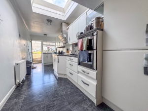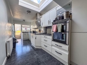 The property occupies a large corner plot with off road parking for 4-5 vehicles. The property features three generous reception rooms including a lounge, dining room and sunroom. There is a 28ft kitchen which is fitted with a range of modern white gloss base and wall units with contrasting worktops and integrated appliances. Roof light providing plenty of natural light and a uPVC double glazed door providing access to the rear garden. On the first floor are three good size bedrooms and a modern family bathroom fitted with a p-shaped bath with shower over, wash hand basin and WC.