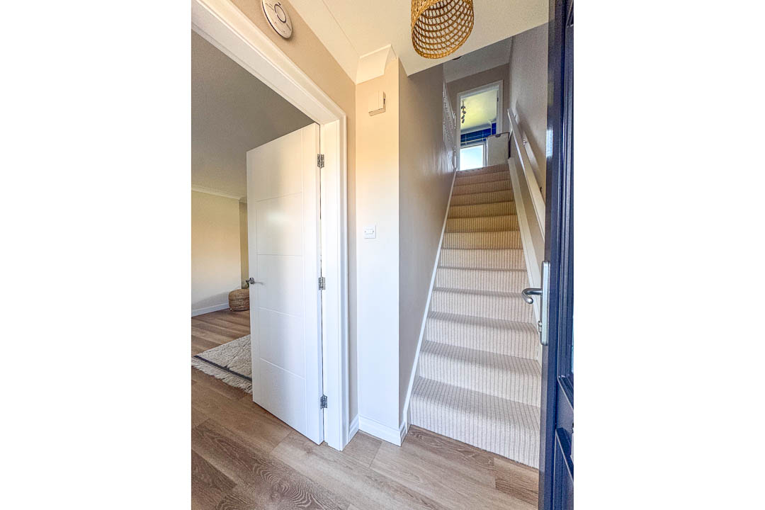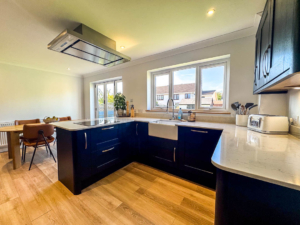 Entering the property via the composite door which leads into an entrance hall with carpeted stairs leading to the first floor and a door into the lounge. The lounge is situated at the front of the property with a feature bay window and wood effect flooring. An opening leads through into the spacious kitchen diner fitted with a modern kitchen comprising of navy base, wall and drawer units with contrasting marble worktops, breakfast bar with seating for three, AEG induction hob and extractor fan above, Bosch oven and microwave, integrated dishwasher and understairs storage cupboard. Off the dining area is a bi-fold door providing access to the rear patio and garden. From the Kitchen is access into the Utility Room with space and plumbing for a washing machine, tumble dryer and fridge freezer, a uPVC double glazed door provides access to the rear garden, a downstairs WC fitted with a wash hand basin with vanity storage below and a WC. From the utility room is a door leading to the garage which has an up and over door to the front and houses the Valliant gas boiler.