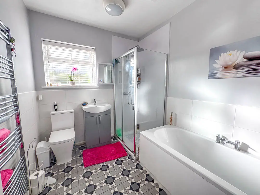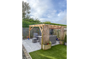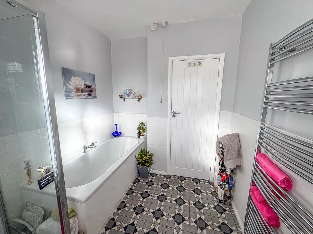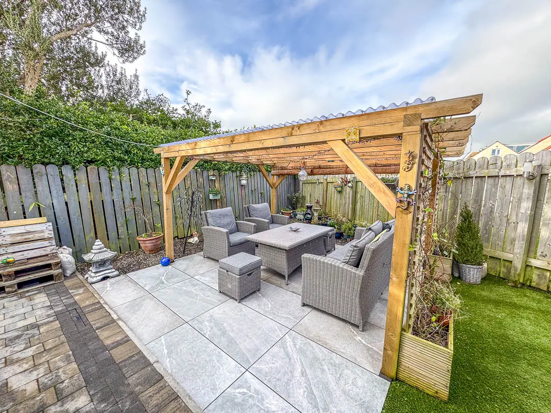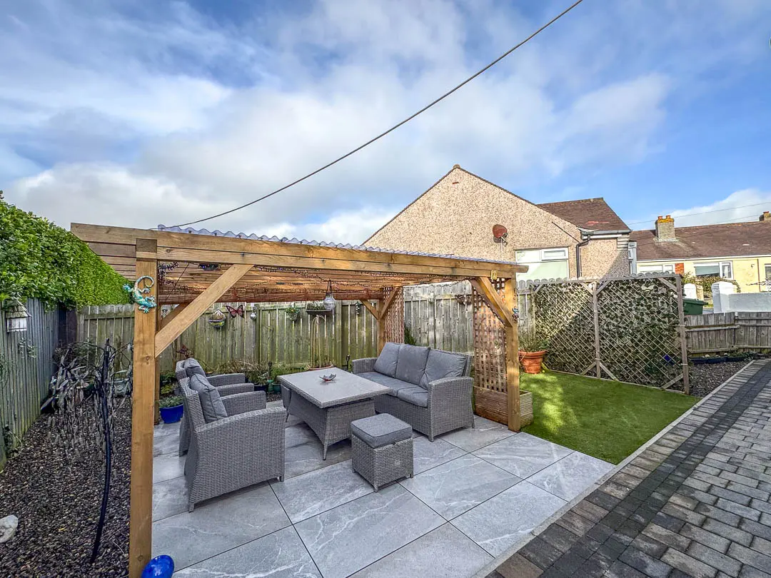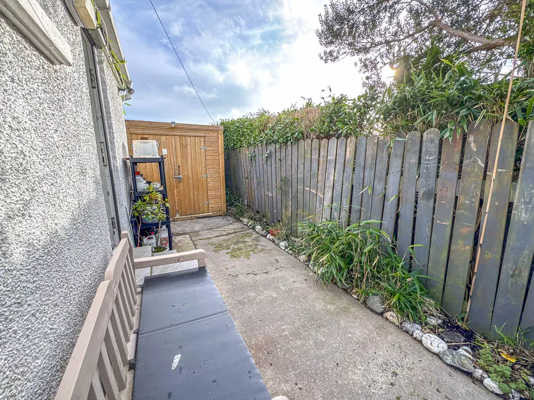 Off the hallway is Bedroom 2, situated at the front of the property and currently being used as a second reception room/TV area, the room is a good sized double bedroom. Bedroom 1 is situated at the rear of the property, again a good sized double room with fitted mirrored wardrobes across the back wall. Lastly, off the hall is the bathroom fitted with a modern white suite comprising bath, shower cubicle with rain effect shower head and separate shower attachment, vanity wash hand basin and toilet. Stainless steel towel rail. The rear garden houses a large wooden shed (12′ x 8′) with power and light installed. Good sized rear/side garden featuring a porcelain tiled private patio with covered pergola (13′ x 12′), perfect area for barbecues and relaxing. An additional artificial grassed area with block paved pathway leading round to the driveway.