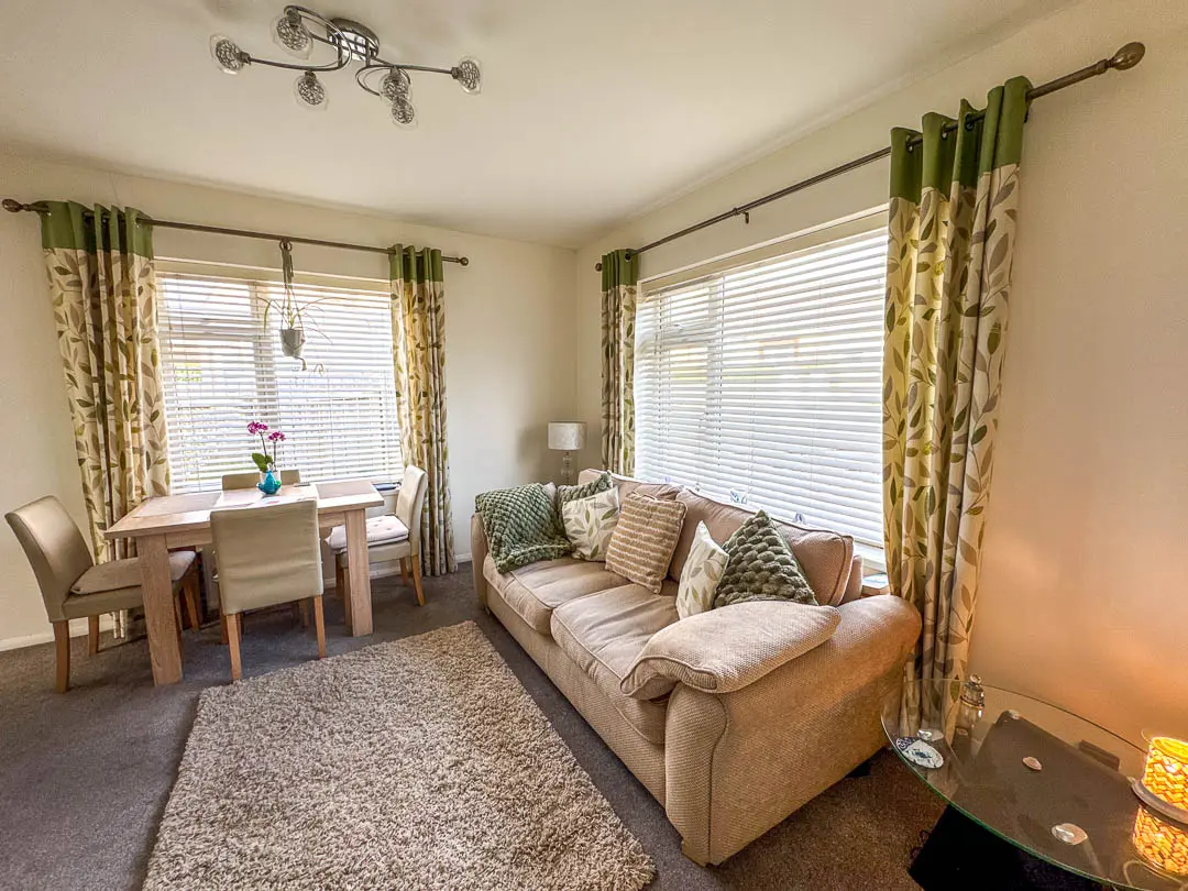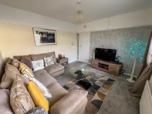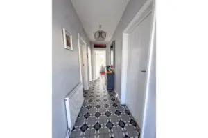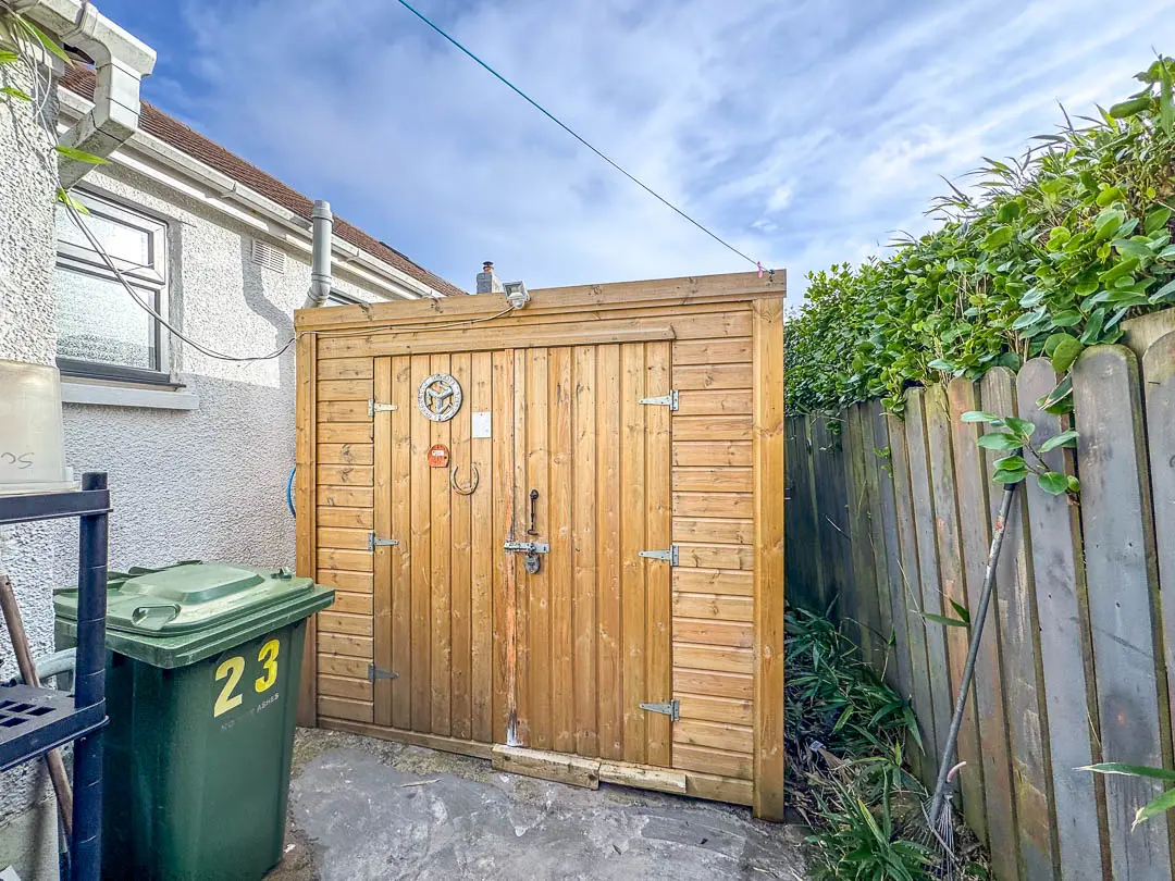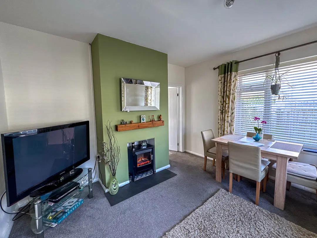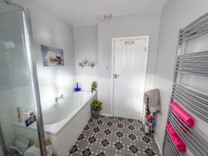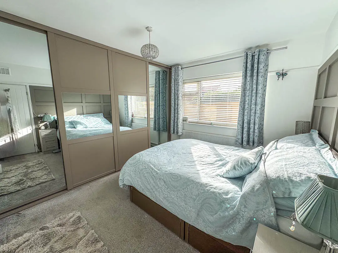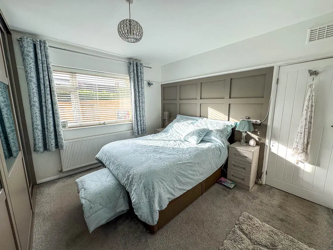 Off the hallway is Bedroom 2, situated at the front of the property and currently being used as a second reception room/TV area, the room is a good sized double bedroom. Bedroom 1 is situated at the rear of the property, again a good sized double room with fitted mirrored wardrobes across the back wall. Lastly, off the hall is the bathroom fitted with a modern white suite comprising bath, shower cubicle with rain effect shower head and separate shower attachment, vanity wash hand basin and toilet. Stainless steel towel rail. The rear garden houses a large wooden shed (12′ x 8′) with power and light installed. Good sized rear/side garden featuring a porcelain tiled private patio with covered pergola (13′ x 12′), perfect area for barbecues and relaxing. An additional artificial grassed area with block paved pathway leading round to the driveway.