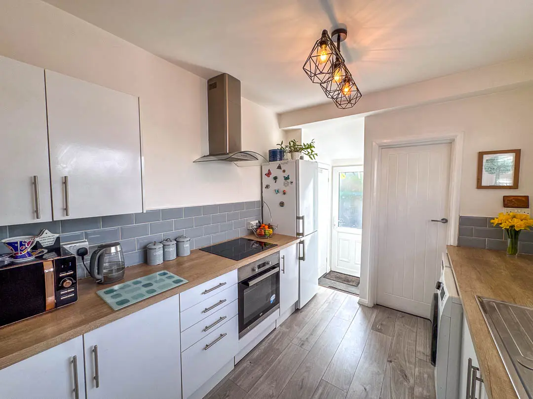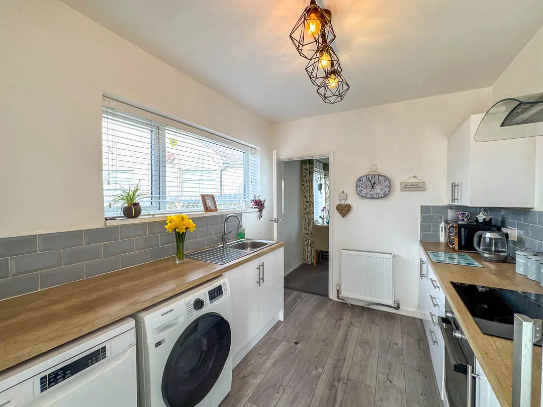 Upon entering the property there is a uPVC door leading into the spacious entrance hall with a loft hatch providing access to the roof space with pull down ladder. Off the entrance hall there is a door into the dual aspect lounge diner with feature fireplace, inset electric log burner and wooden mantle. Door to kitchen fitted with a range of white base, wall and drawer units and contrasting wood effect work tops, an integrated ceramic hob and oven with stainless steel extractor over. Space for washing machine, dishwasher and fridge freezer. There are two very useful walk in storage cupboards, one houses the gas boiler with shelving, the other acts as a cloakroom and pantry. uPVC door leading to the rear garden.