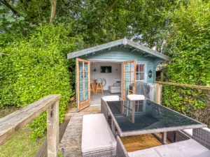 There is a generous garage with storage space above and off-road parking and a front garden. At the rear is a private, sunny garden with well established shrubs and trees, a raised deck and summer house with bar and electric providing a very sociable space for entertaining with gorgeous views across the valley.