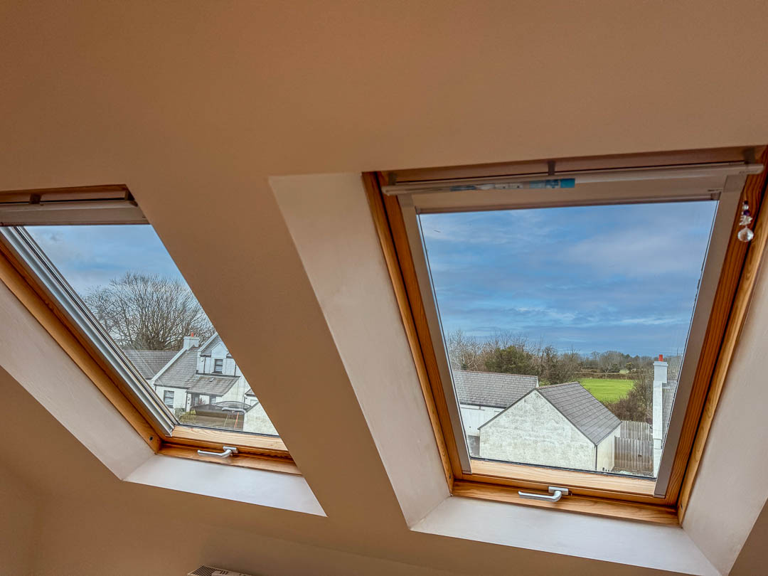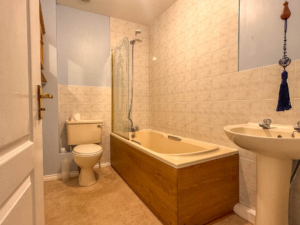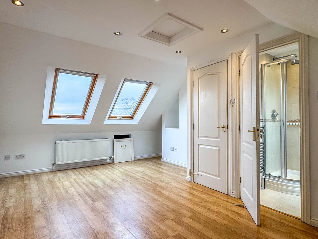 On the 1st floor there is spacious landing with three bedrooms, two of which are good sized doubles and the third is a single or an ideal study space. The family bathroom is fitted with a panelled bath, wash hand basin and WC. From the 1st floor landing there are stairs up to the top floor where bedroom 4 is located, which is a large double bedroom with built in eaves storage on both sides and three Velux windows offering plenty of natural light. Bedroom 4 benefits from an en-suite shower room fitted with a corner shower cubicle, wash hand basin and WC, Velux window.