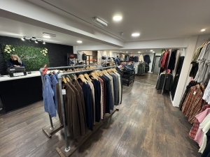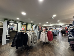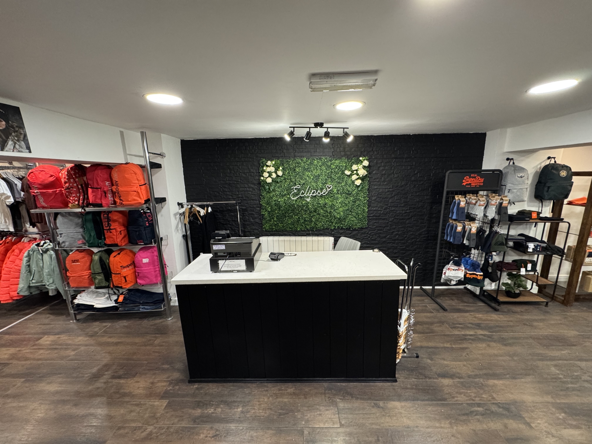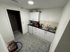 Fully fitted-out retail unit with LED lighting, shelving display, counter, separate kitchen,