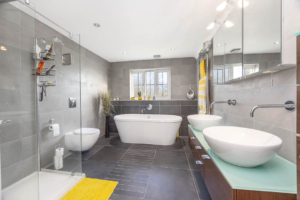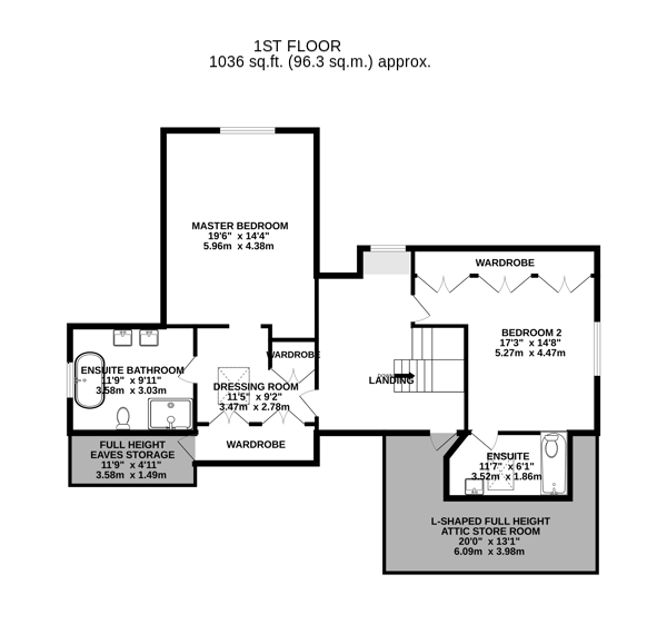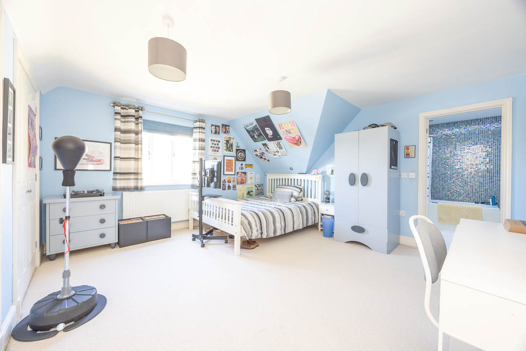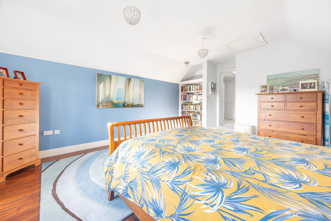 Taking the turning staircase up to the 1st floor there is a spacious galleried landing which could double up as a reading/study space. Off the landing is the Master Bedroom suite, which initially leads into a large walk through dressing room with built in storage and a doorway into full height walk in eaves storage. The dressing room benefits from a Velux skylight offering plenty of natural light, an opening with steps down lead into the master bedroom which has a large uPVC double glazed window taking in stunning views of the surrounding countryside. The en-suite bathroom is accessed off the dressing room, and comprises of a contemporary free standing double ended bath, ‘His’ and ‘Hers’ wash hand basins, walk in shower cubicle and WC. Double glazed window offering plenty of natural light and looking across the gardens. Bedroom 2 is accessed off the galleried landing and is an exceptionally sized bedroom with fitted wardrobes, a uPVC double glazed window to the southwest aspect, this bedroom benefits from an en-suite bathroom fitted with a panelled bath, wash hand basin and WC, skylight offering plenty of natural light. Lastly off the galleried landing there is a doorway leading to further, walk in, storage which wraps round, if desired this could be utilised to reconfigure the layout.