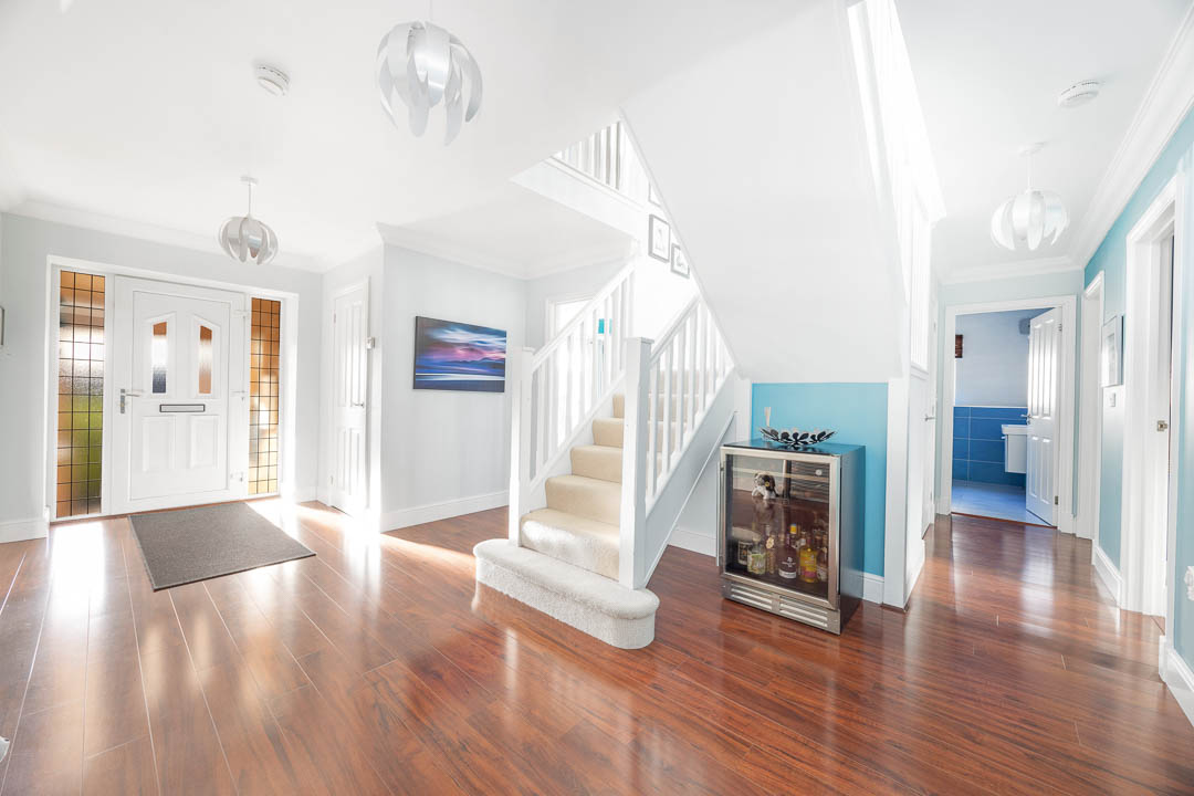 Upon entering the property there is a spacious entrance hall with a feature turning staircase giving access up to the 1st floor. Off the entrance hall is a large walk in coat cupboard (and a large built in airing cupboard which houses the pressurised hot water cylinder). The principle living space is to the right which features an exceptional sized lounge with triple aspect uPVC double glazed windows offering plenty of natural light, stunning wood effect floor throughout, which continues through the entrance hall. Off the entrance hall is a large open-plan modern kitchen/dining/family room, the kitchen is fitted with a range of contemporary style wall and base units with granite worktops and a large breakfast bar island with units and worktops to match. Two double glazed windows looking onto the rear garden and a set of French patio doors giving access directly to the outside space. Off the kitchen diner is a door into the utility room which has a range of wall and base units and stone worktops that match and compliment the kitchen dining space. From the utility room there is a door out to the gardens. In addition to the lounge and kitchen diner there is an additional TV room, which is a spacious southwest facing reception room with a set of sliding double glazed patio doors giving access out to a large private sun terrace which attracts the sun throughout the day and has stunning rural views. Lastly off the entrance hall are Bedrooms 3 and 4, both excellently sized double bedrooms and a large family shower room with a walk in shower cubicle, wash hand basin with vanity unit below and WC, fully tiled floors.