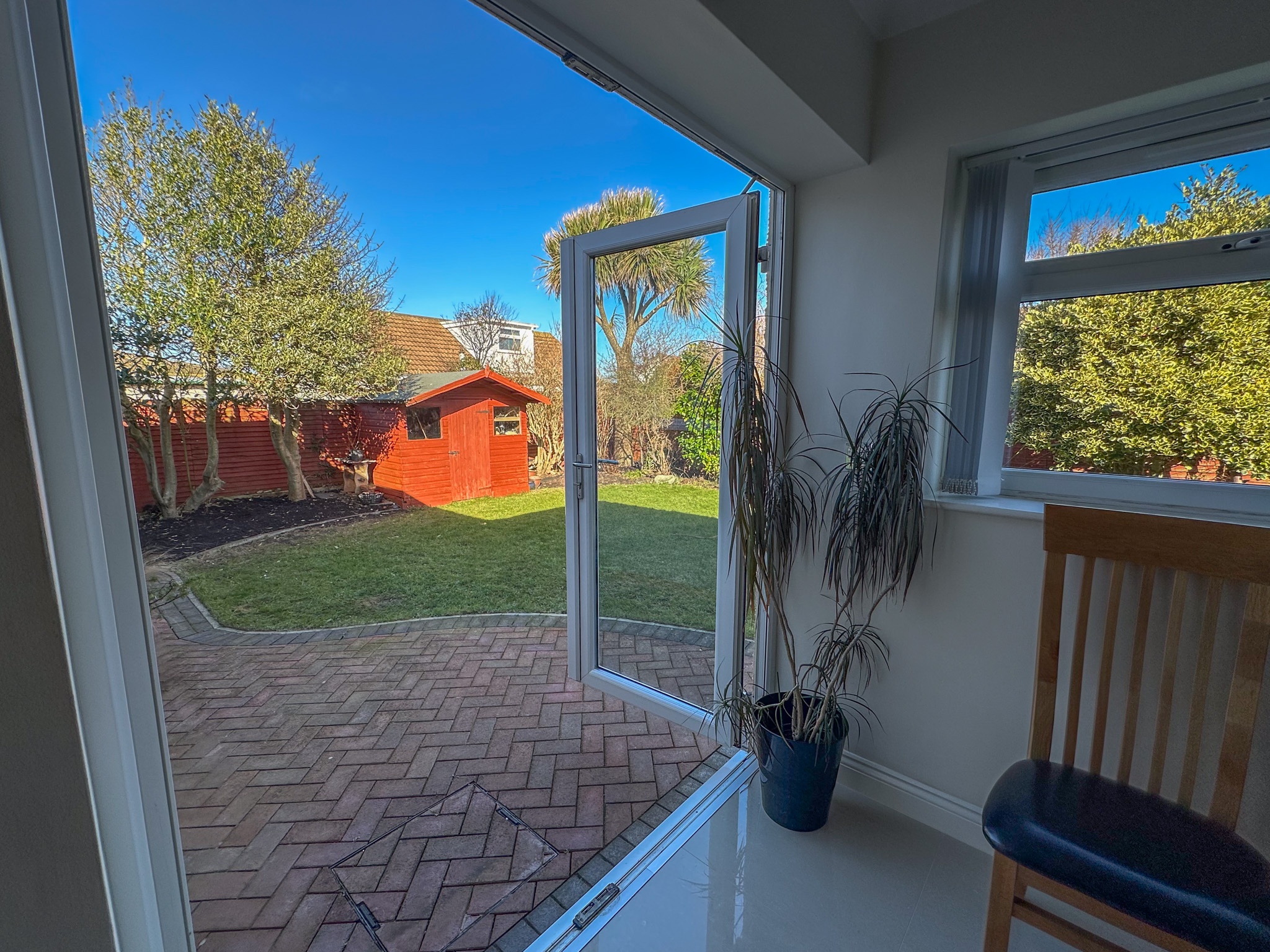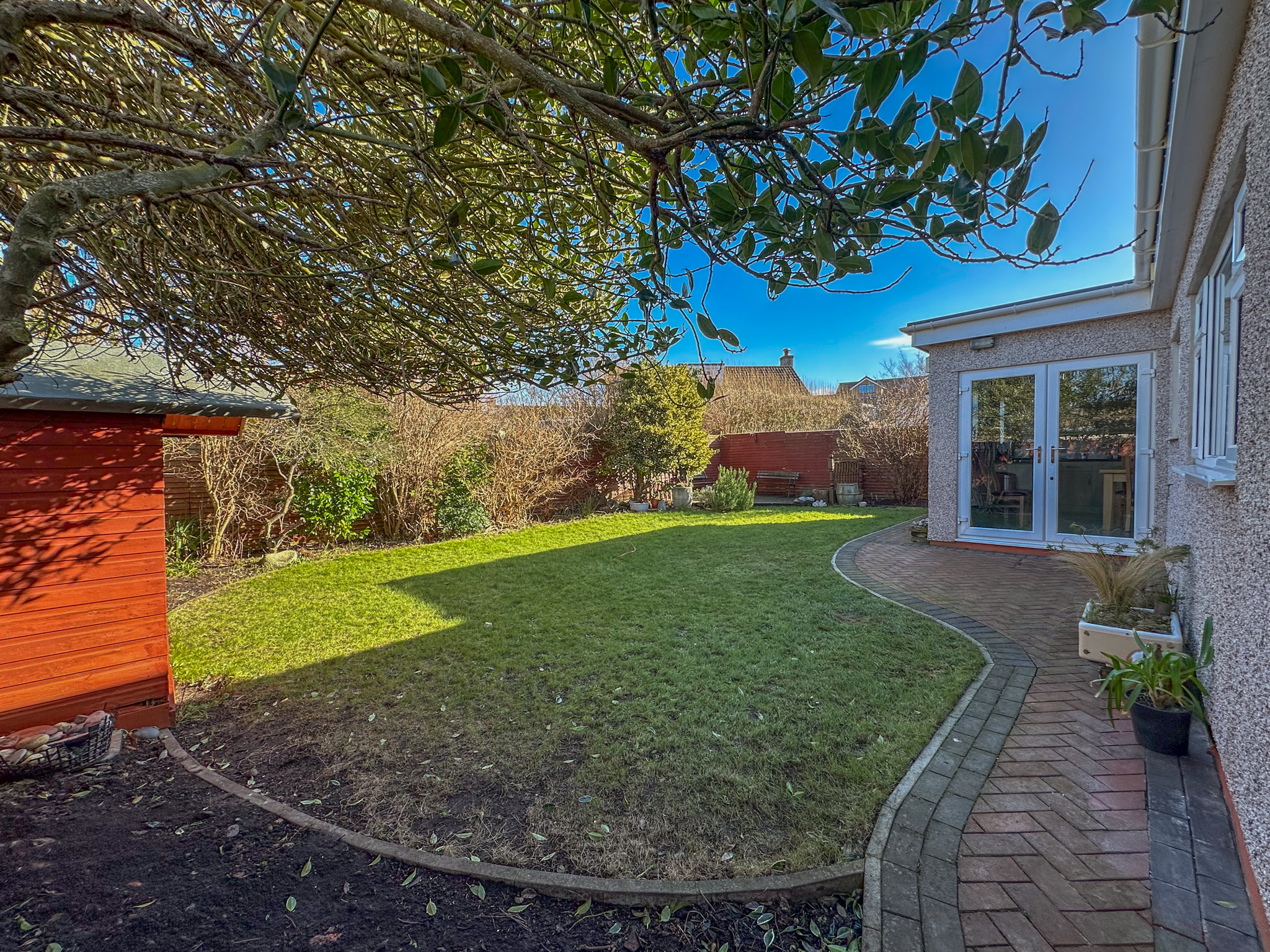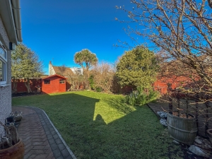 At the rear of the property is a private garden laid to lawn with mature trees and shrubs, a sunny deck, wooden shed and side access to the front of the house. At the front is a single garage with a block paved driveway providing off road parking and a front garden laid to lawn.