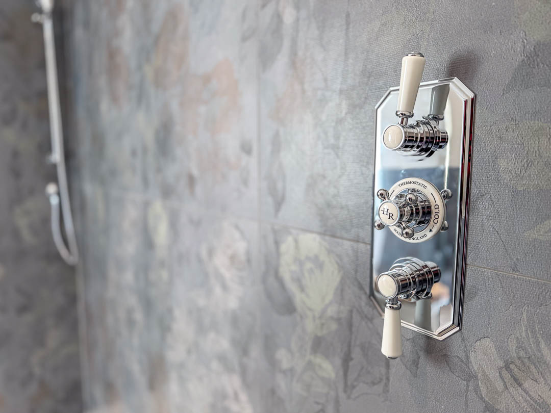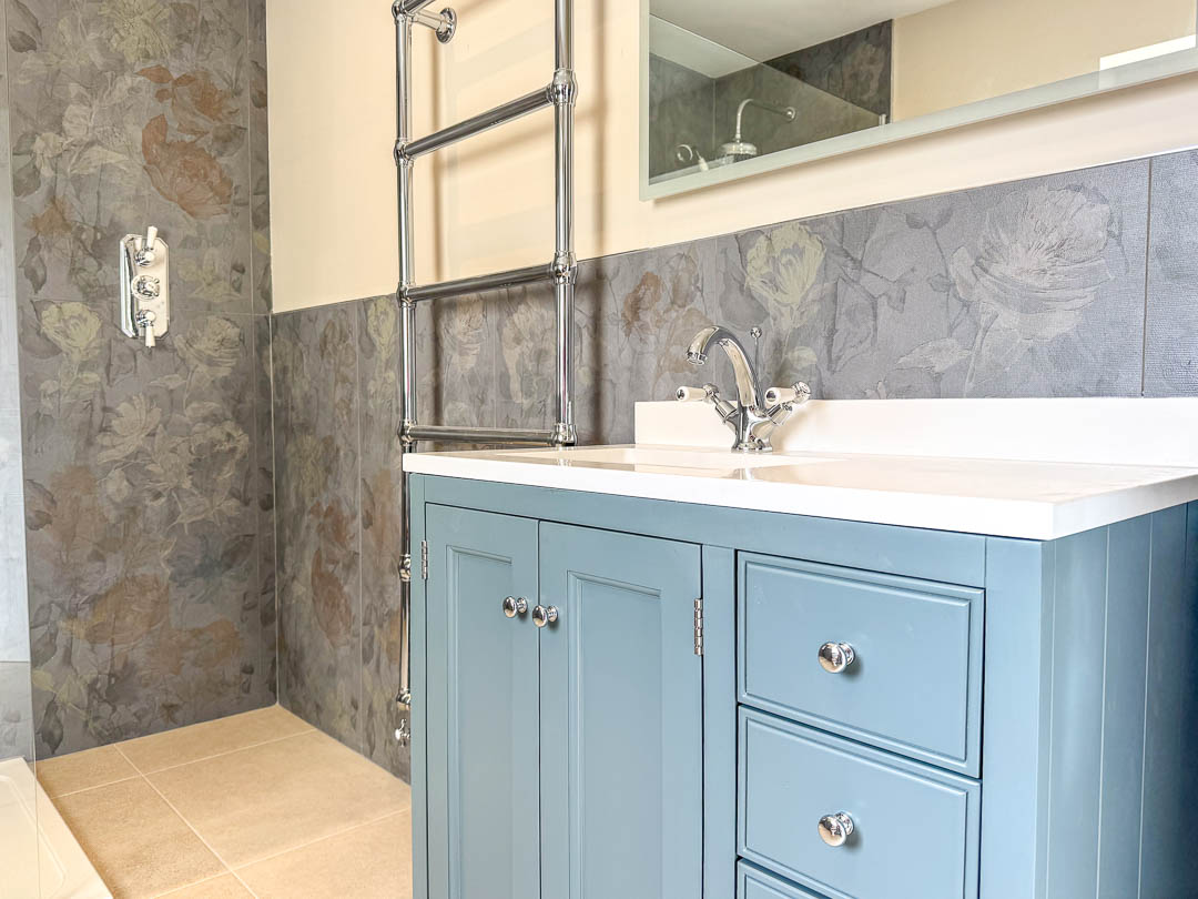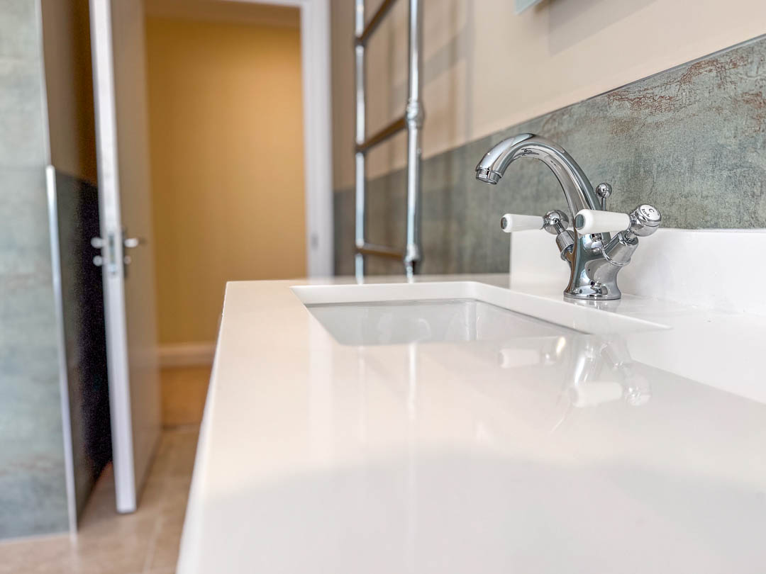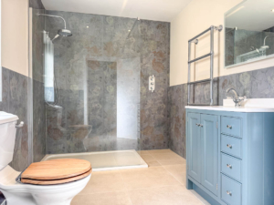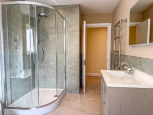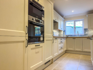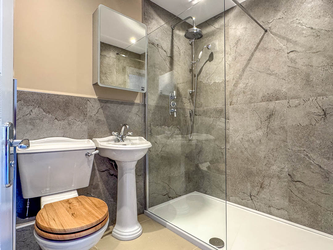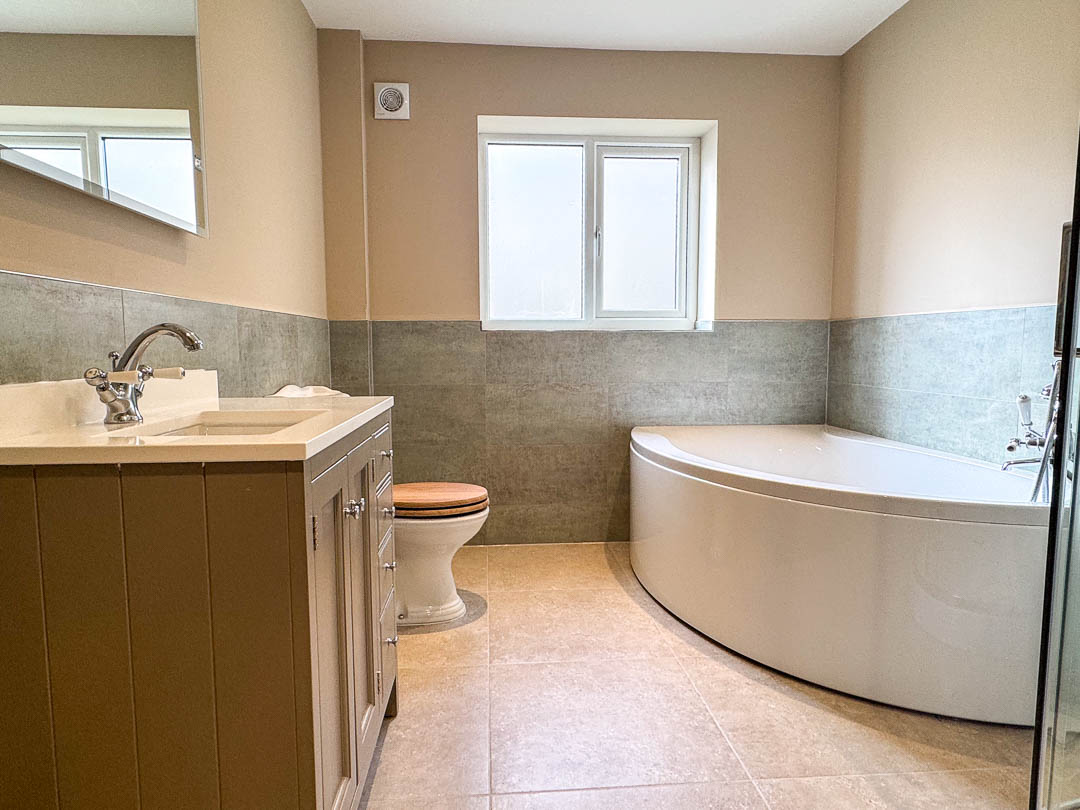 The master suite, accessible off the entrance hall via a set of stairs, is an extremely spacious bedroom with a walk-in wardrobe and a large master en suite bathroom which has been newly fitted with a contemporary suite comprising of a walk in shower cubicle with Heritage fittings, wash hand basin with a light blue vanity unit below with ample storage and an illuminated mirror above and WC, chrome wall mounted towel rail, floral tiles around the shower and part way up the walls and neutral floor tiles. Bedroom 2 is a large spacious double bedroom with sliding patio doors giving access onto the sun terrace, a walk in wardrobe and a newly fitted en-suite comprising of a large walk in shower cubicle with Heritage fittings, wash hand basin with illuminated mirror above and WC, tiles to the shower and part way up the walls and tiled floors. Bedroom 3 is a spacious double bedroom with fitted wardrobes and a double-glazed door with windows either side, giving access to the property’s rear courtyard patio area. In addition to the bedrooms there is also a large family bathroom which has been newly fitted with a large corner bath and corner shower, both with Heritage fittings, wash hand basin with a taupe vanity unit below with ample storage and an illuminated mirror above, WC, chrome towel rail, tiled walls and floors. Lastly, off the hallway, there is a door to a walk-in boiler room, which doubles up as an airing cupboard providing plenty of storage and has plumbing for a washing machine.