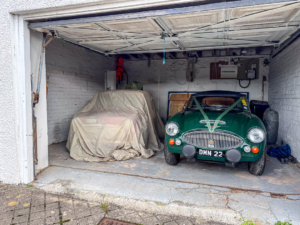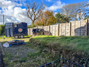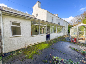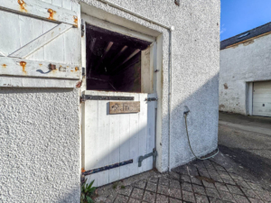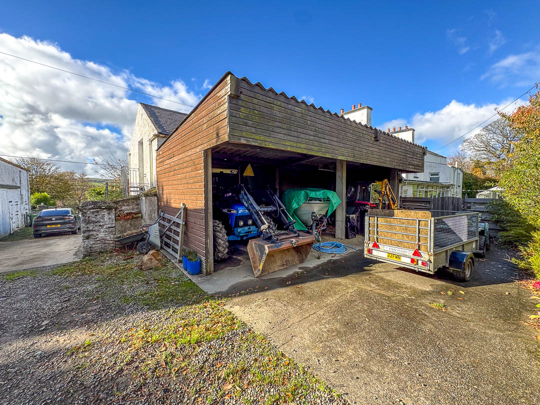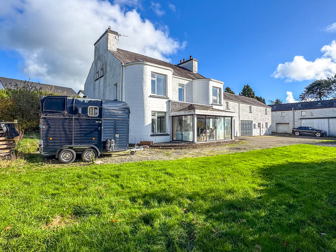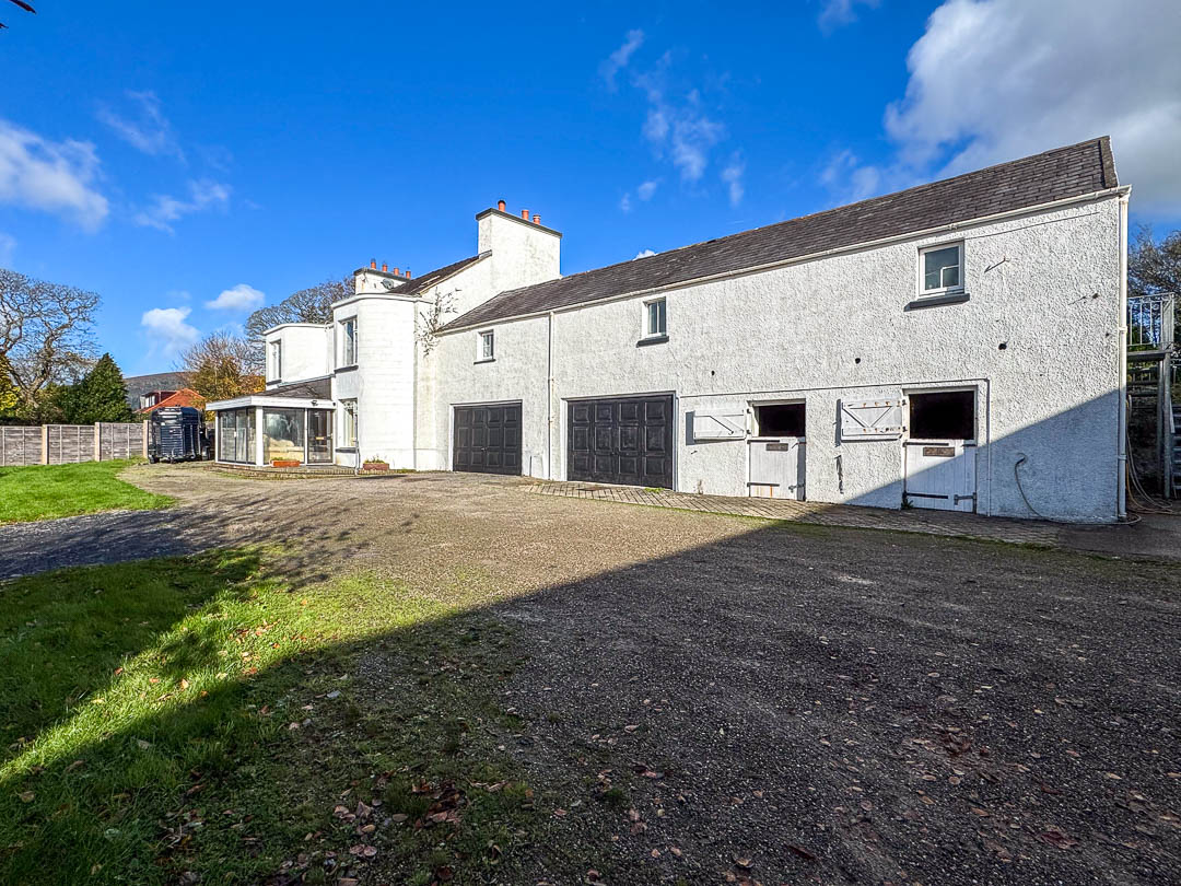 Externally, the property is approached from Ballagarey Road and benefits from extensive parking in front of the house, garages, and stables. A lawned garden to the side leads around to the rear of the property, where there is a paved yard and a covered storage area.