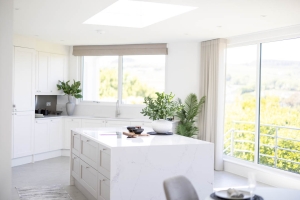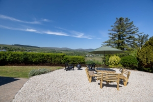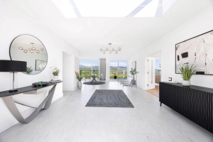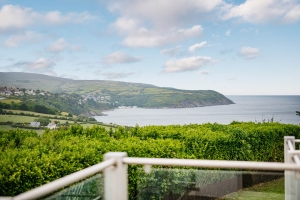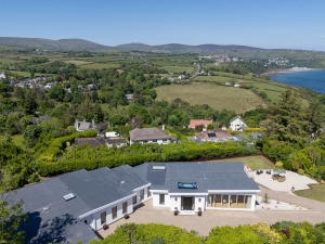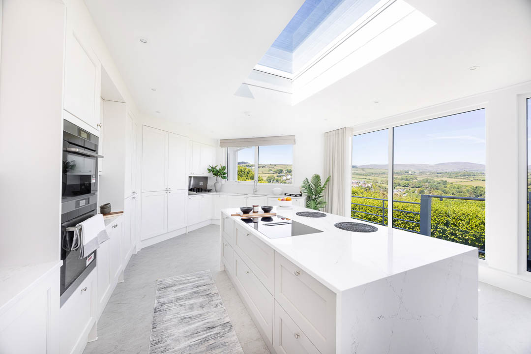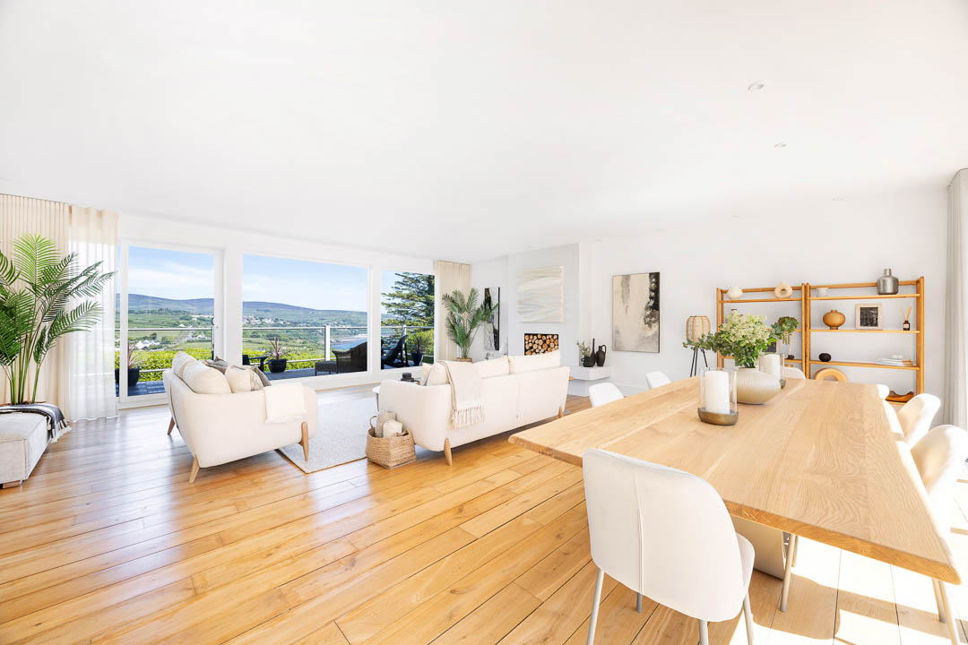 Beyond its private gated entrance, the home opens into a dramatic reception hallway with a stunning atrium-style glazed ceiling, setting an elegant tone that flows throughout the interior. The heart of the home is a spectacular open-plan lounge, designed around a bespoke feature fireplace, solid oak reclaimed floors and framed by floor-to-ceiling patio doors that lead onto a wide, decked balcony—ideal for entertaining or quiet reflection with ever-changing sea and mountain vistas. A high-spec breakfast kitchen complements the contemporary design with sleek cabinetry, premium integrated appliances, a central breakfast bar- all positioned to enjoy natural light and breath-taking views.
