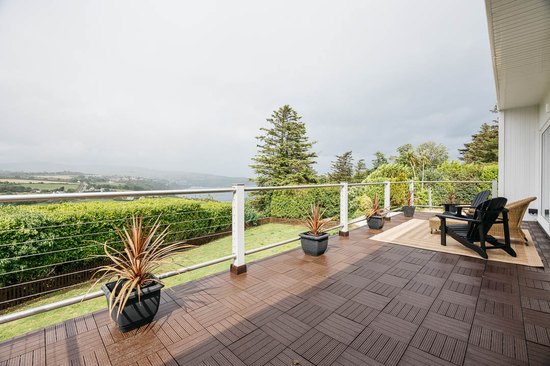 Outside, beautifully landscaped gardens wrap around the property, featuring expansive lawns, mature trees, and multiple elevated decked areas designed to take full advantage of the spectacular surroundings. The block-paved driveway offers extensive parking and a sense of arrival fitting for a home of this calibre.