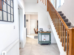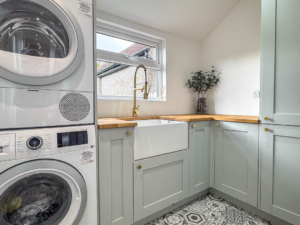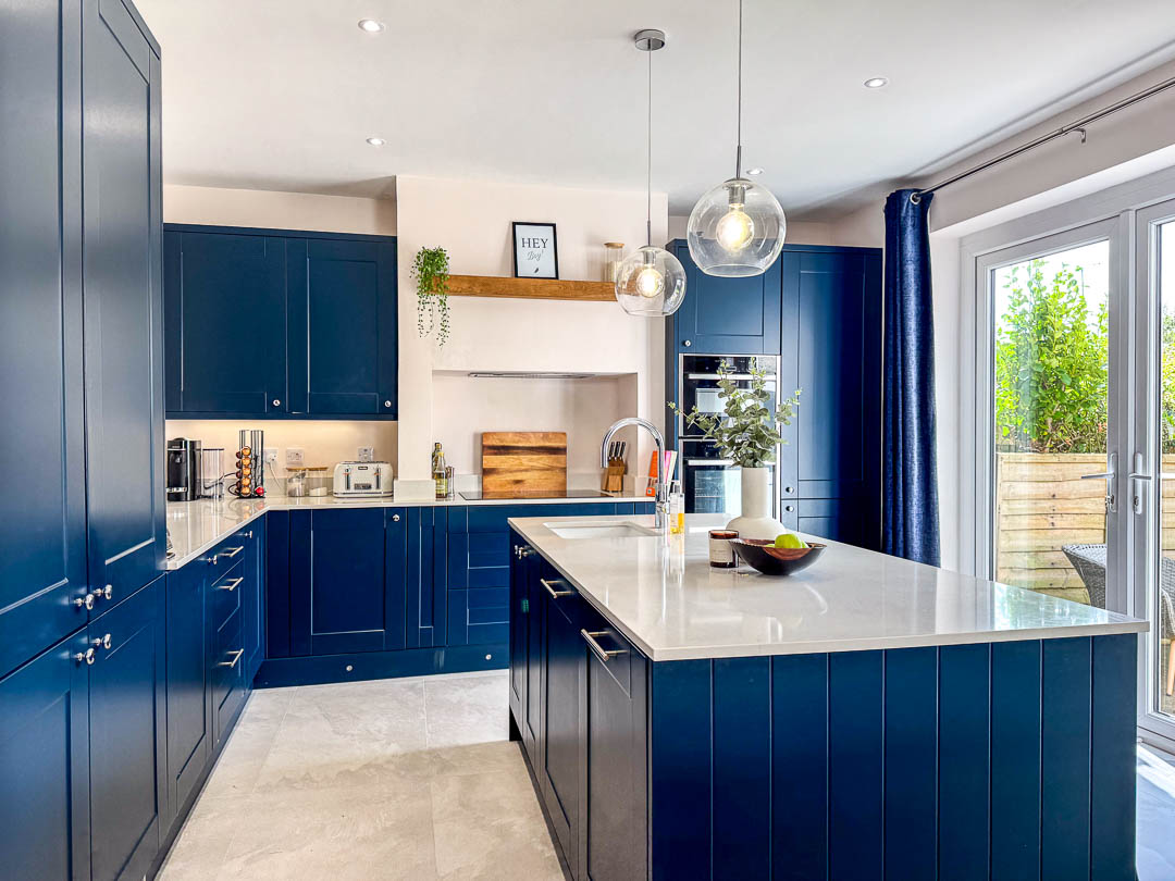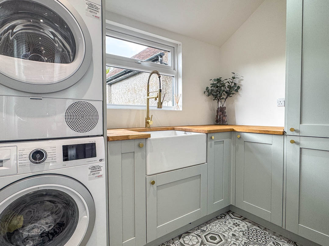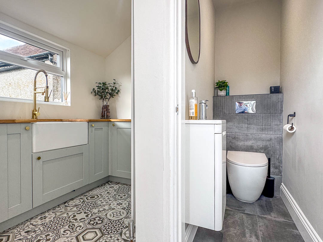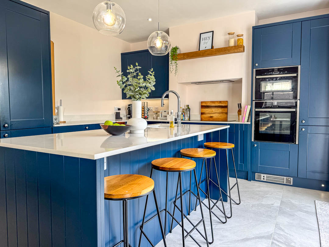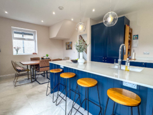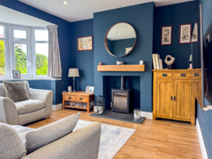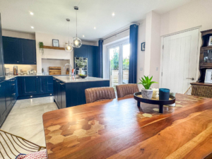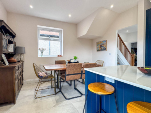 To the front and side is off street parking for 3-4 vehicles and a lawned garden with path leading to the front door. Upon entering the property there is a porch leading through to the spacious and bright entrance hall with built in cloaks cupboard. To the front of the property there is a bay fronted lounge with log burner. From the entrance hall an opening leads through to the open-plan kitchen diner, with a newly fitted kitchen featuring contemporary navy wall, base and drawer units with stone worktops and a large island with breakfast bar to the centre, NEFF kitchen appliances and Quooker tap. Double glazed doors provide access out onto the rear garden and a doorway that leads through to a fully modernised utility room and downstairs WC.