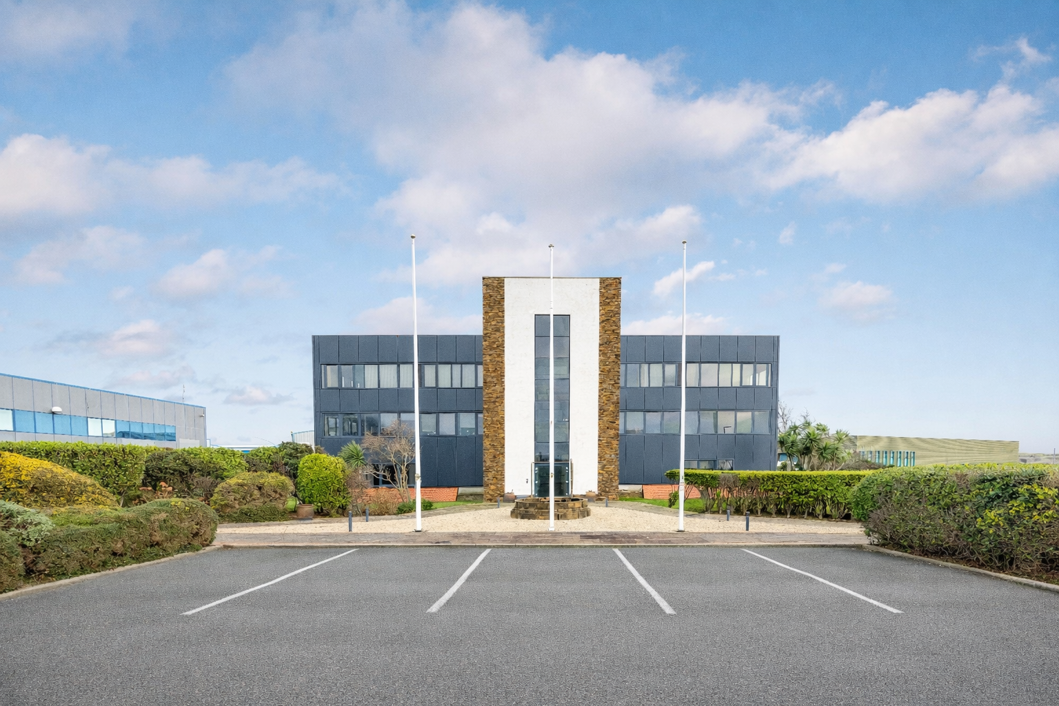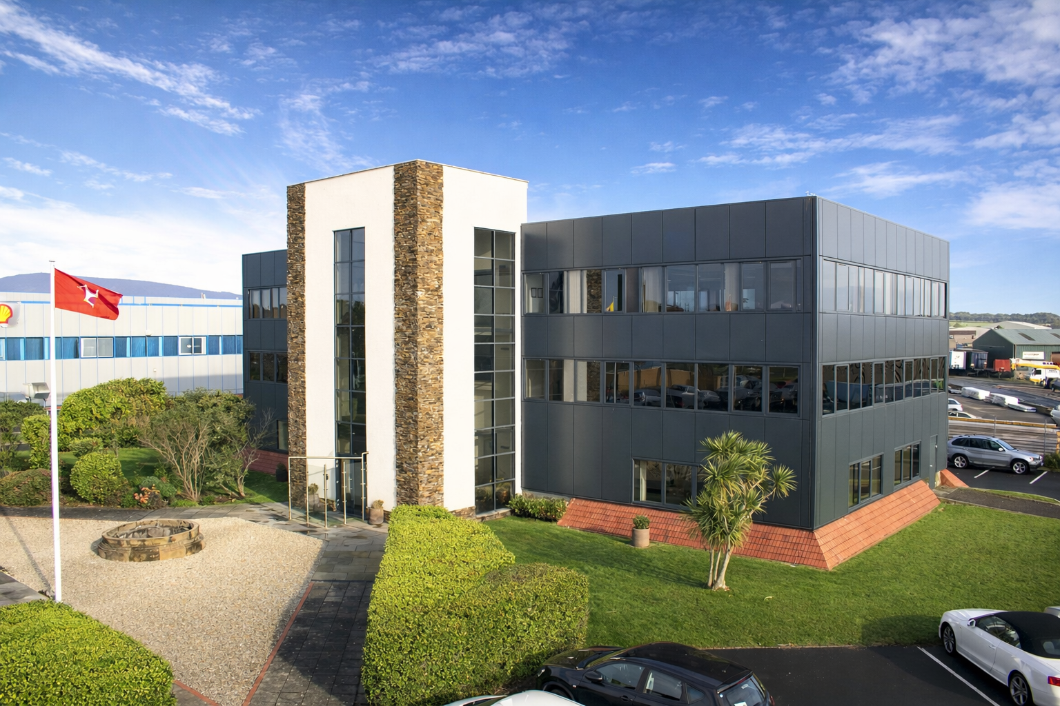 The Isle of Man Freeport is situated immediately adjoining the Island’s only airport – Ronaldsway, providing excellent links in and out of the Island. Travelling south from Ballasalla take the left turn at the roundabout into Ronaldsway Airport. At the next roundabout turn left again and follow the road round to the right where Euromanx House can be found on the the left hand side.