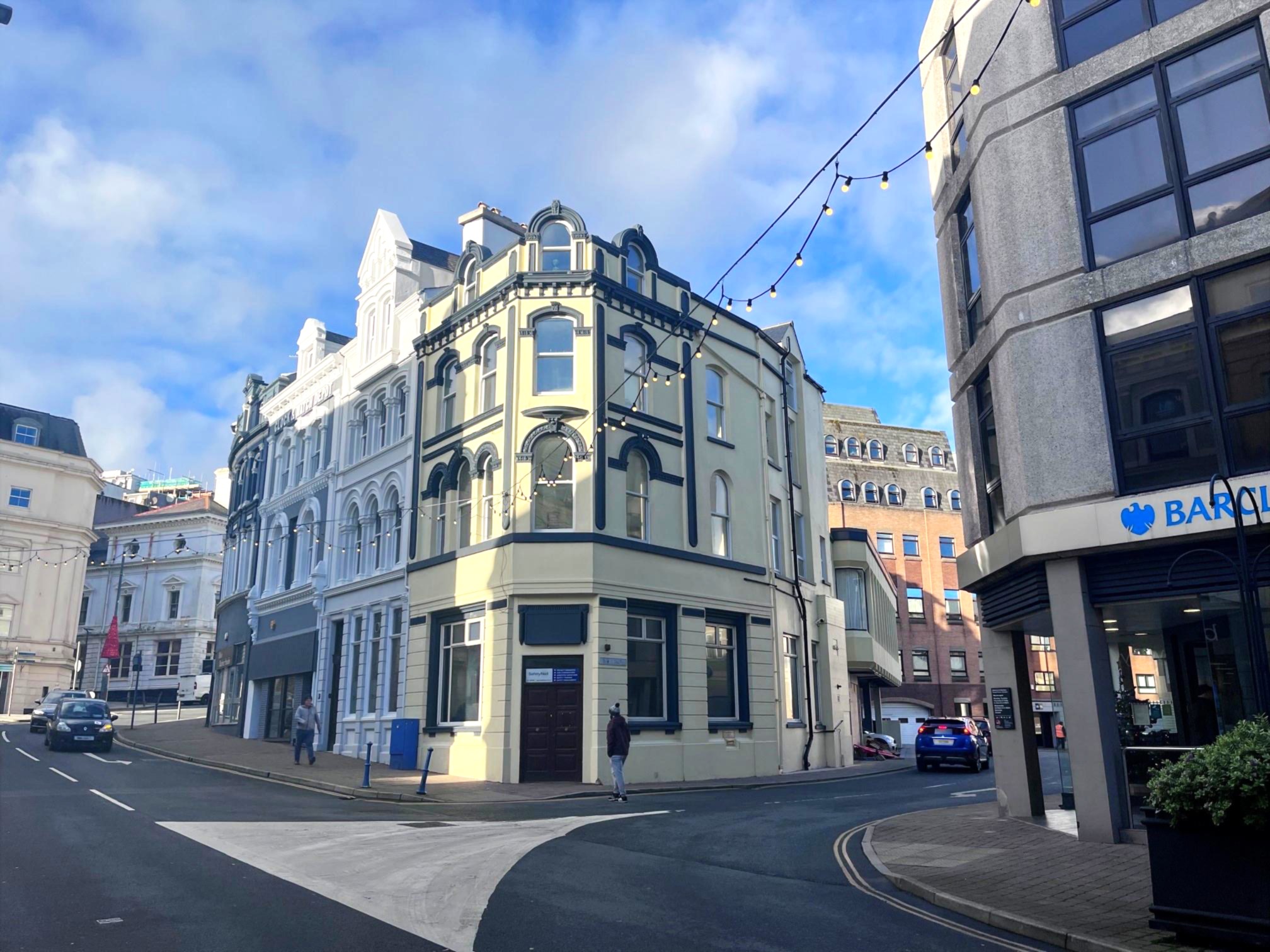 Approaching from the traffic lights at Circular Road, turn left onto Prospect Hill past Government Offices and onto Victoria Street. St Thomas House is in a prime corner position, on the corner of Victoria Street and Thomas Street/Market Street, opposite Barclays Bank main branch.