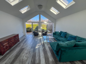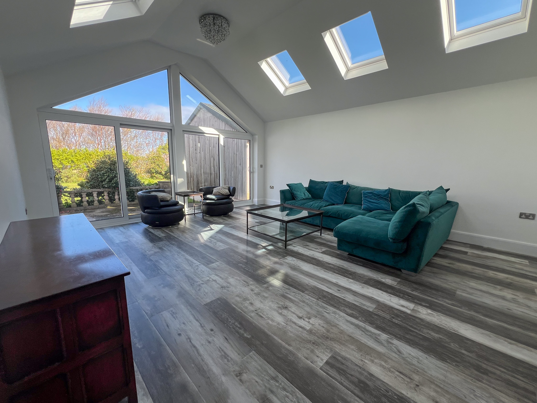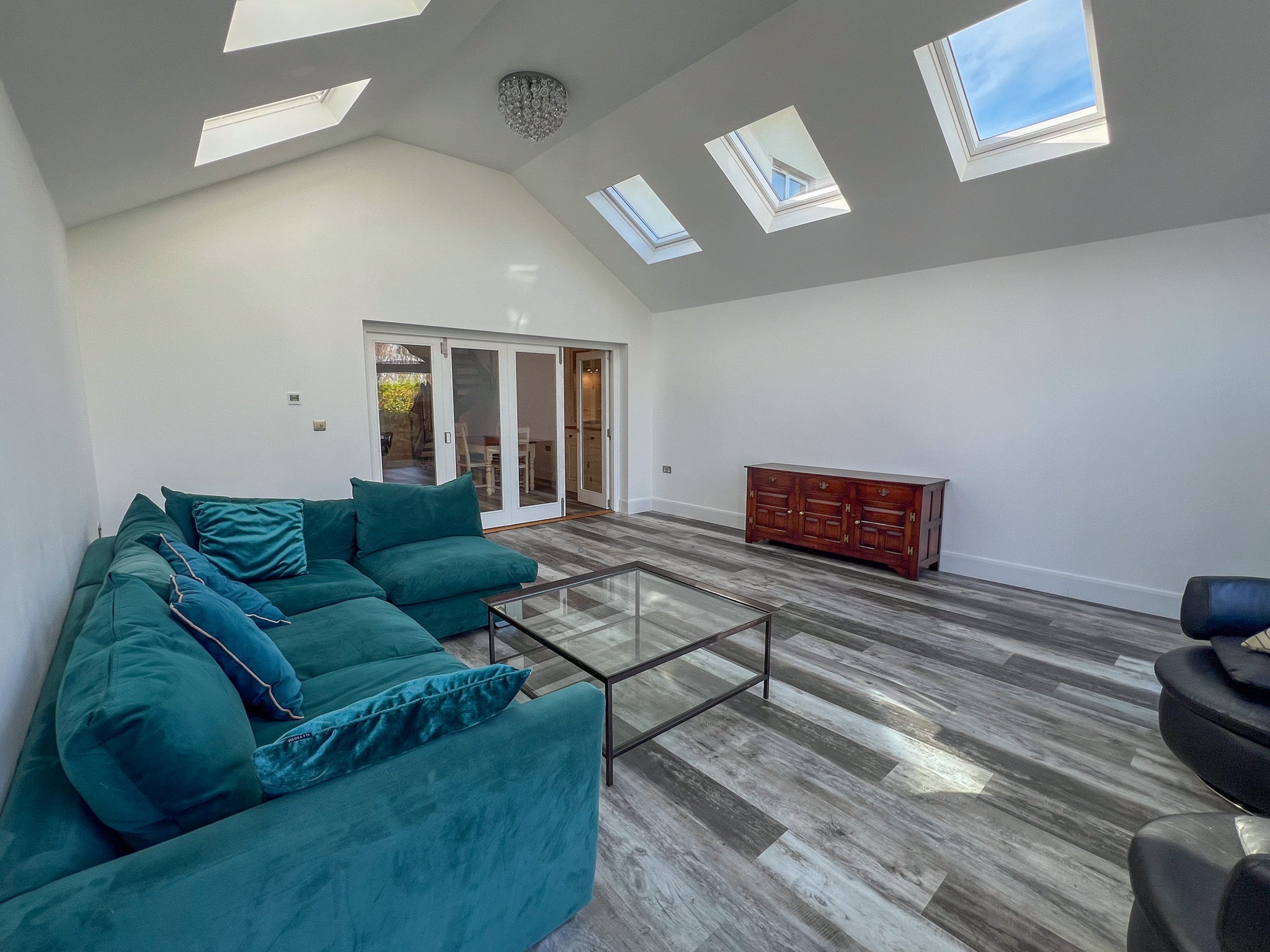 • Sunny sitting room with valuated ceiling, Velux windows & sliding doors leading to the terrace & lawned garden