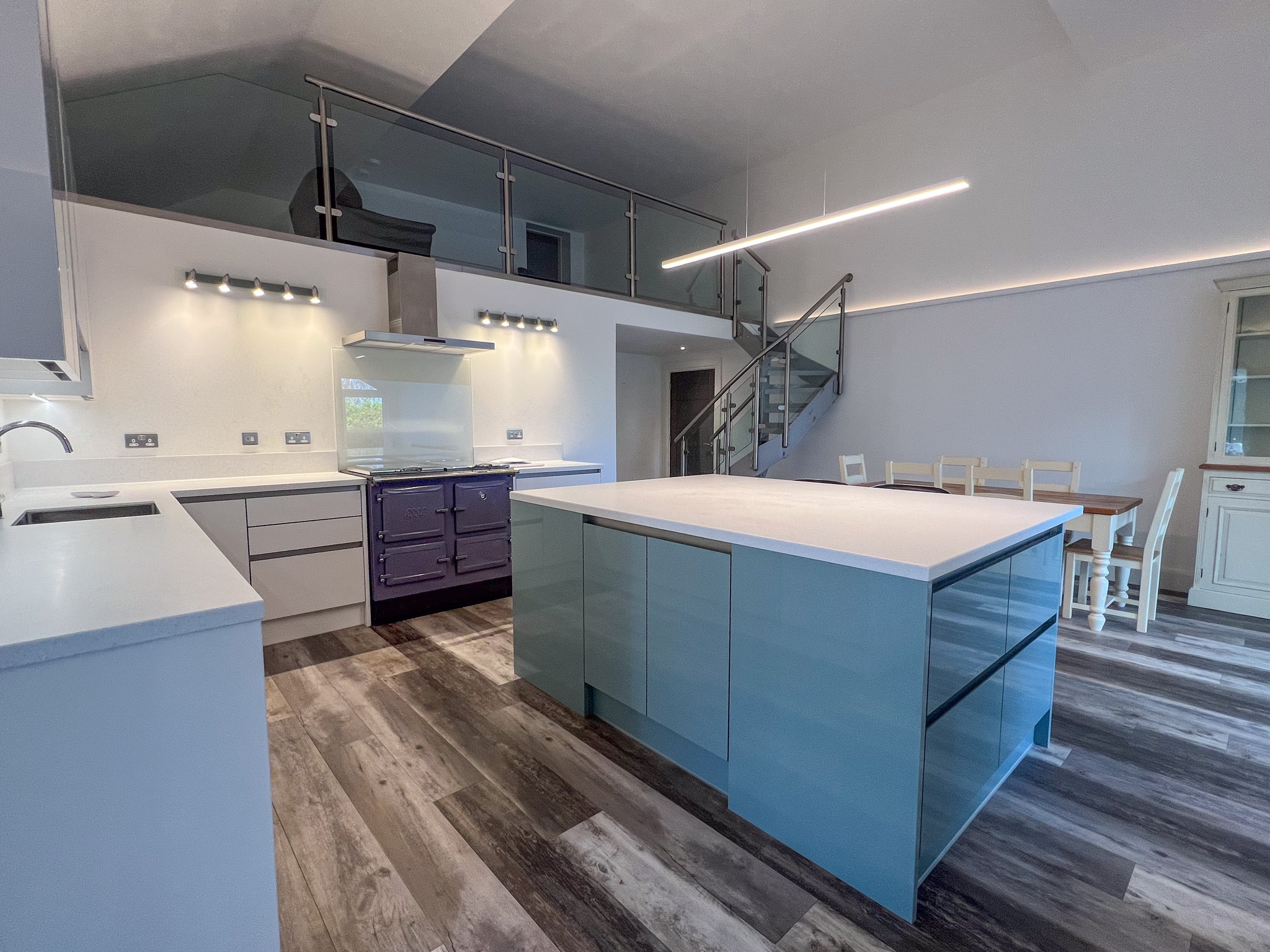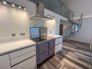 •  Kitchen featuring modern range cooker with induction hob and hot plate, boiler tap, modern aga with hob, integrated appliances and LED/mood lighting