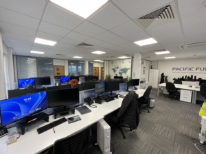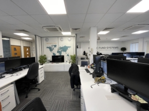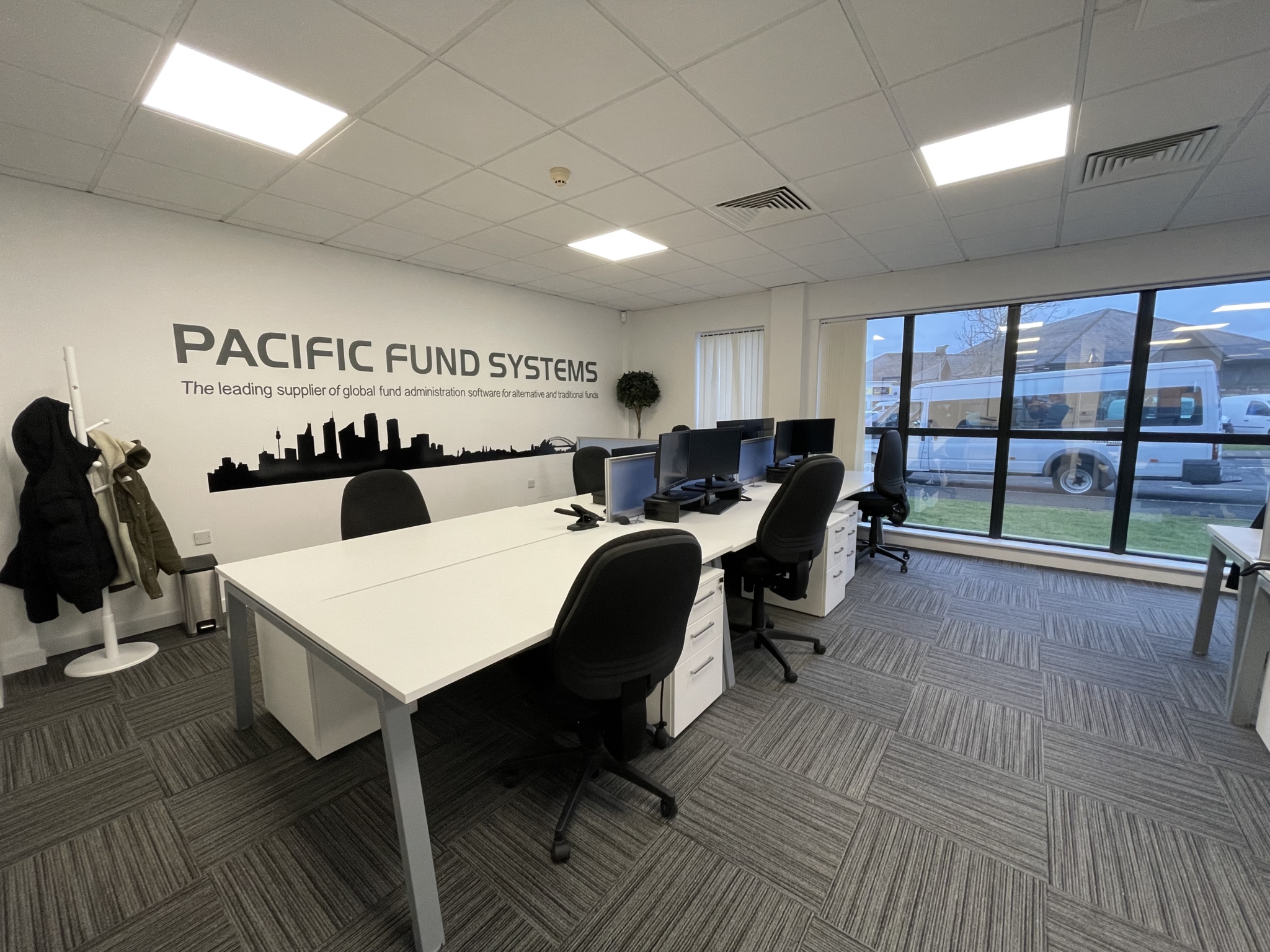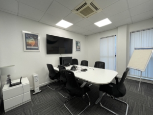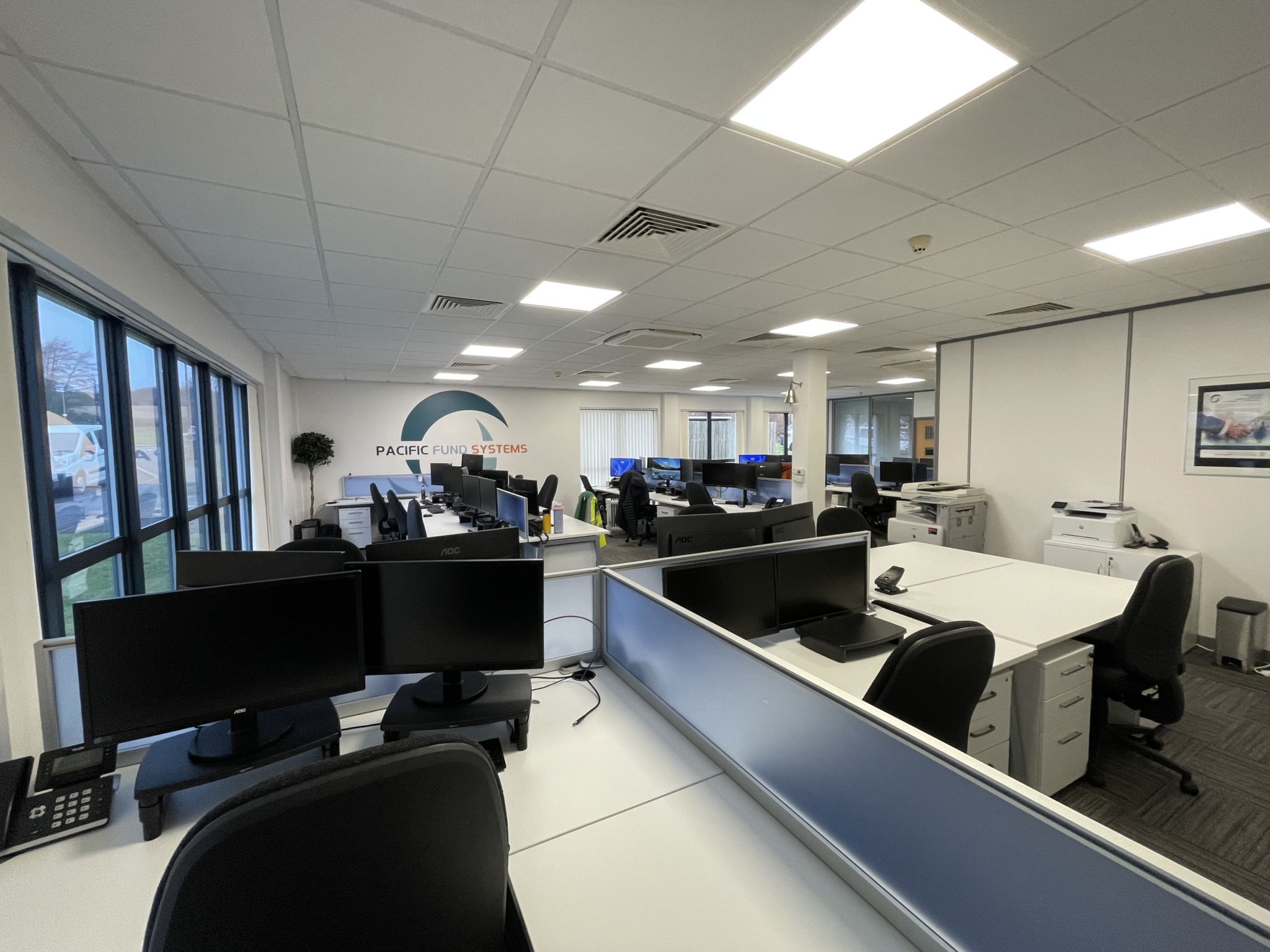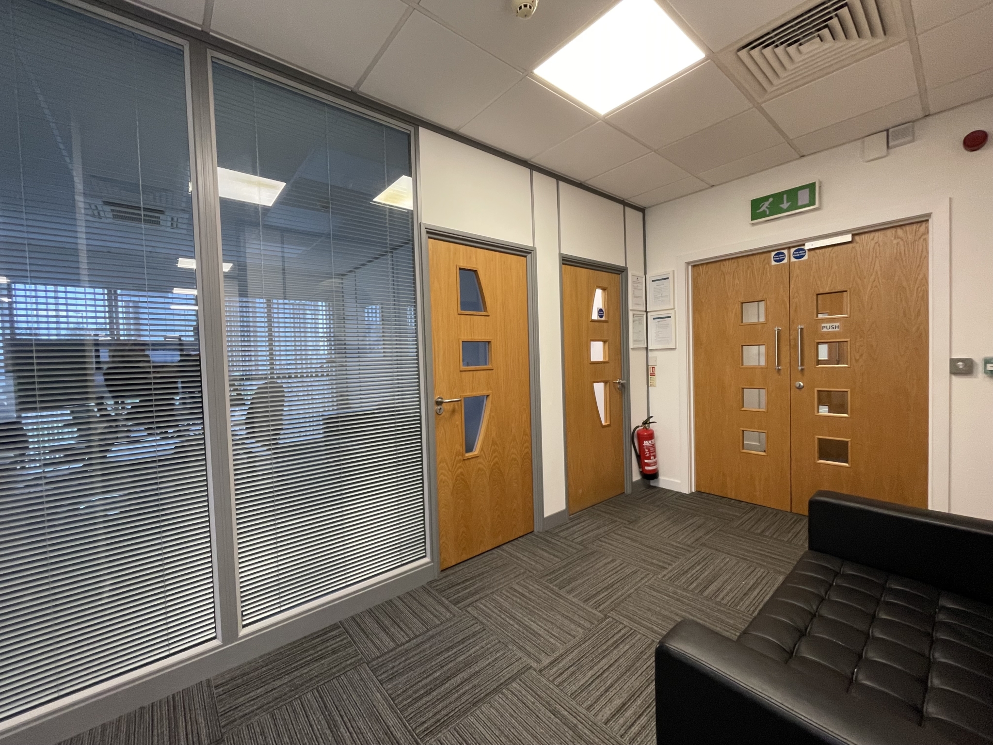 • Floor to ceiling double glazed windows, raised access floors, heating/air conditioning ceiling units, LED lighting ceiling panels. Glass partitioned Office, Boardroom and modern kitchen within suite.
