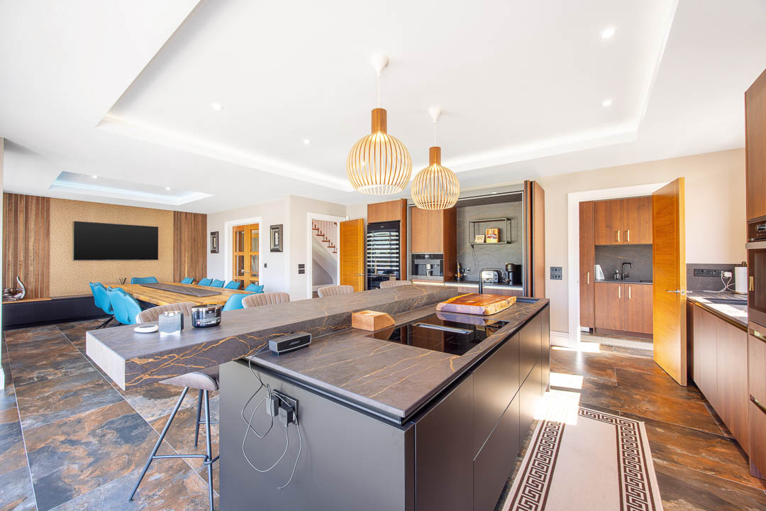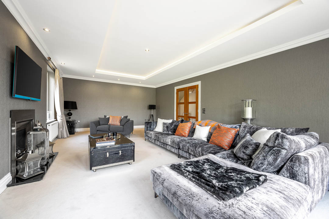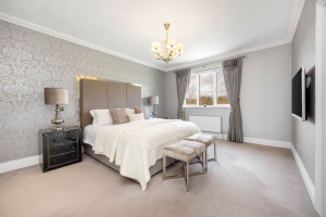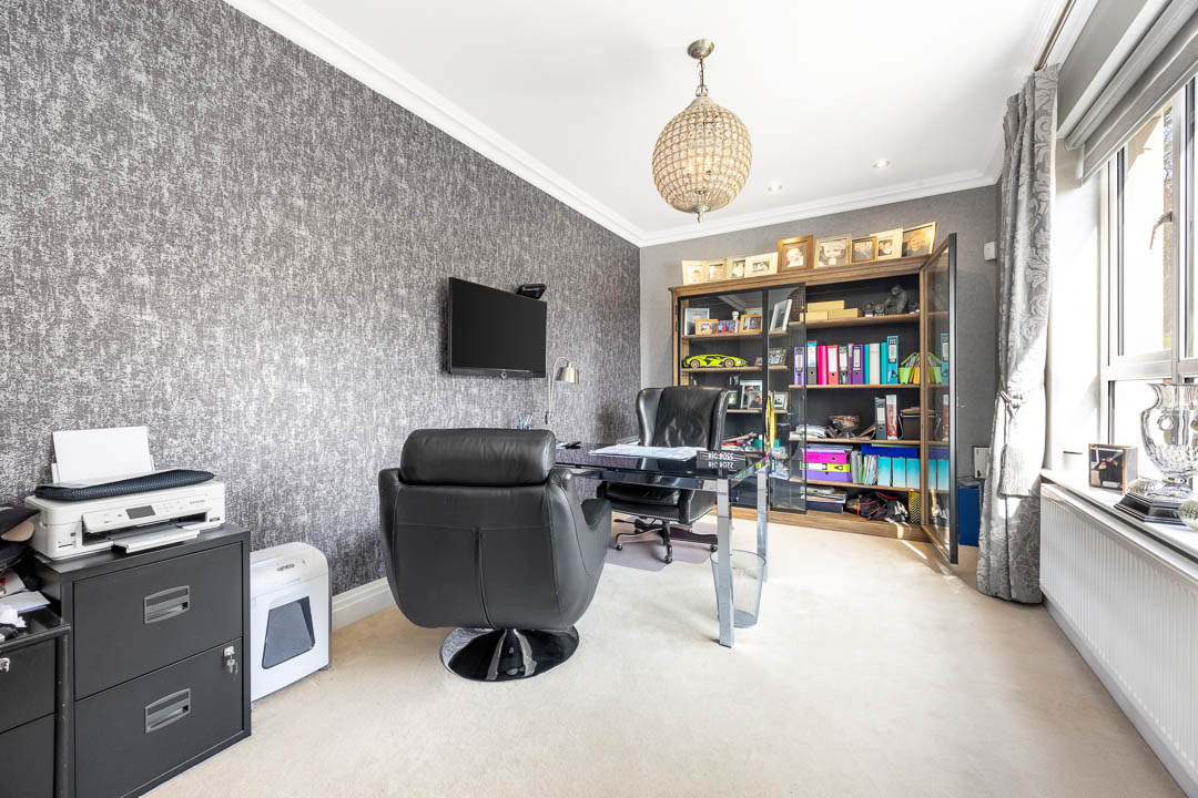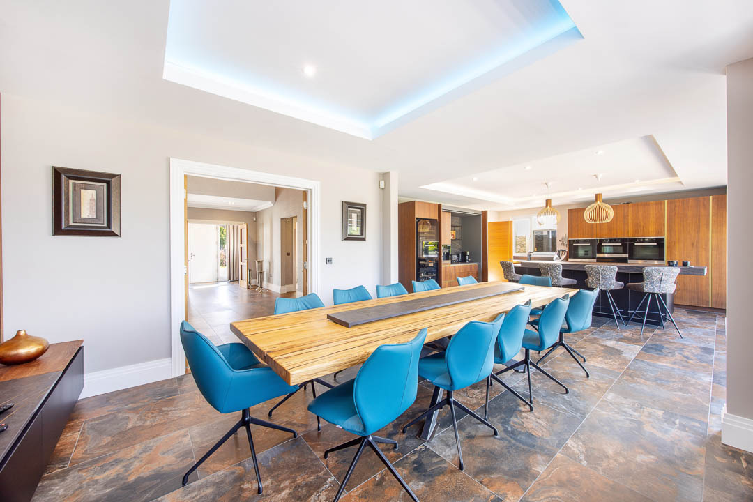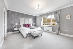 Upon entering the property there is an imposing double-height entrance hall with feature staircase leading to the first floor. A brand newly fitted, superbly appointed and exquisitely finished breakfast-kitchen sets the bar, opening into a family dining room itself linking perfectly back into the entrance hall. The living room is a spacious dual aspect room with a set of French doors leading out to the gardens. There are a further two reception rooms on the ground floor including a study and TV room. On the first floor is a master bedroom suite with a walk-in dressing room and en-suite bathroom, a further four double bedrooms- all with en-suites.