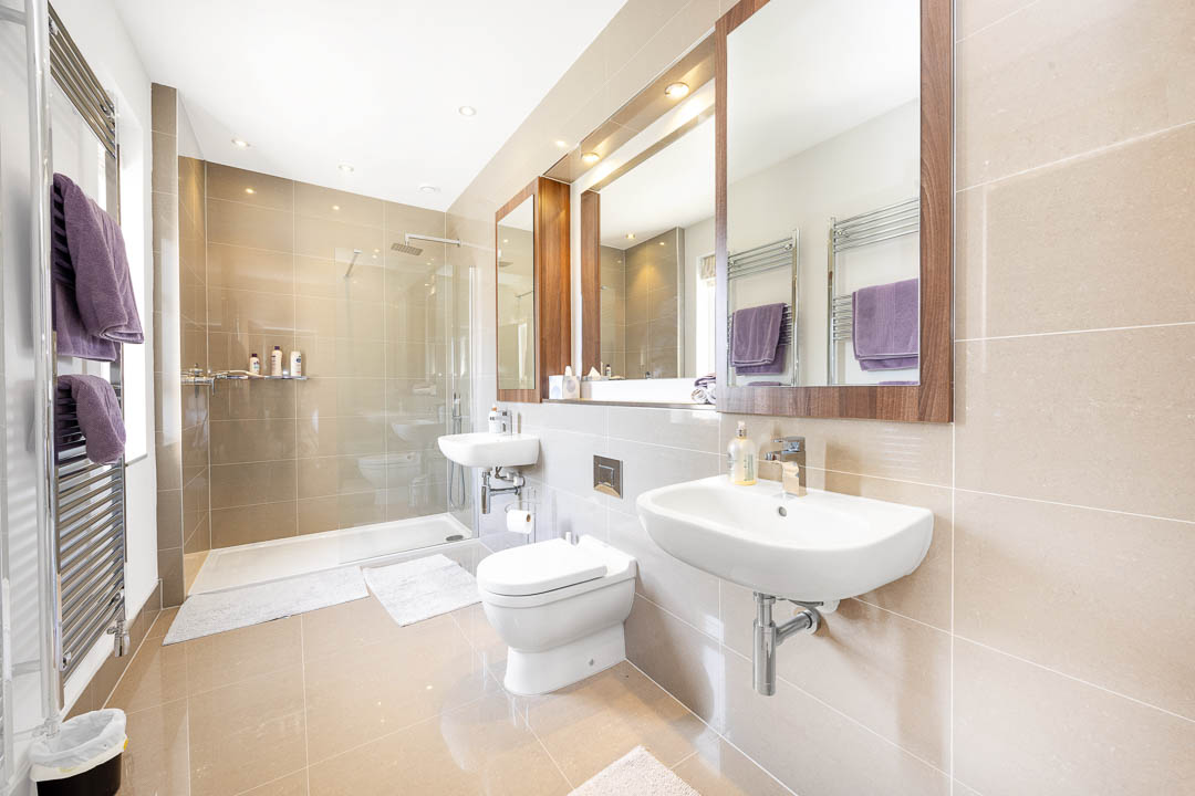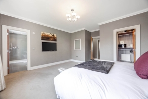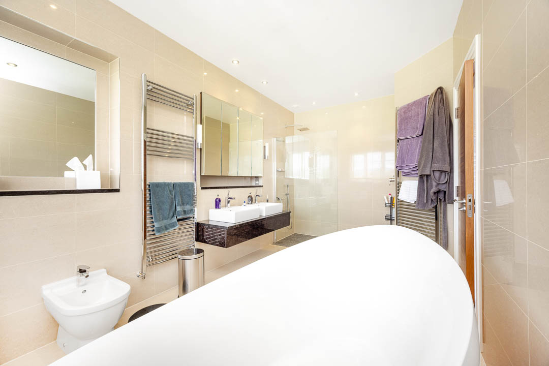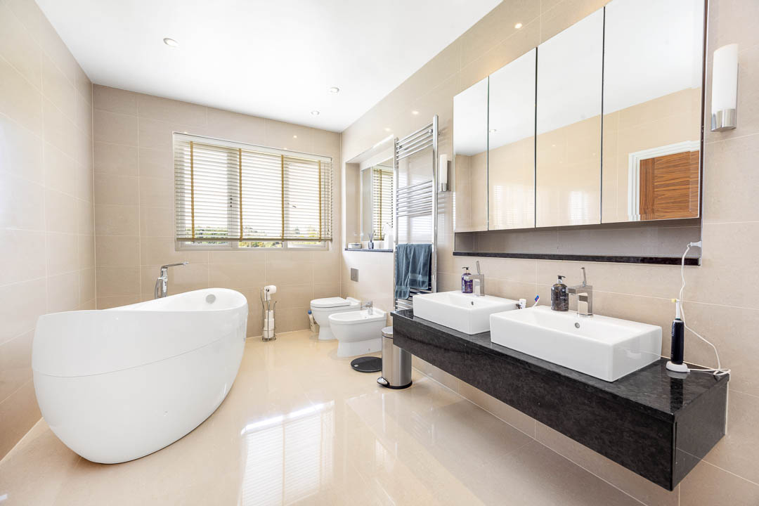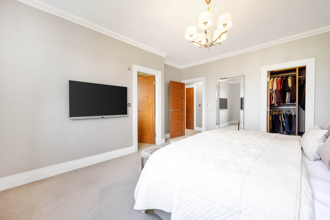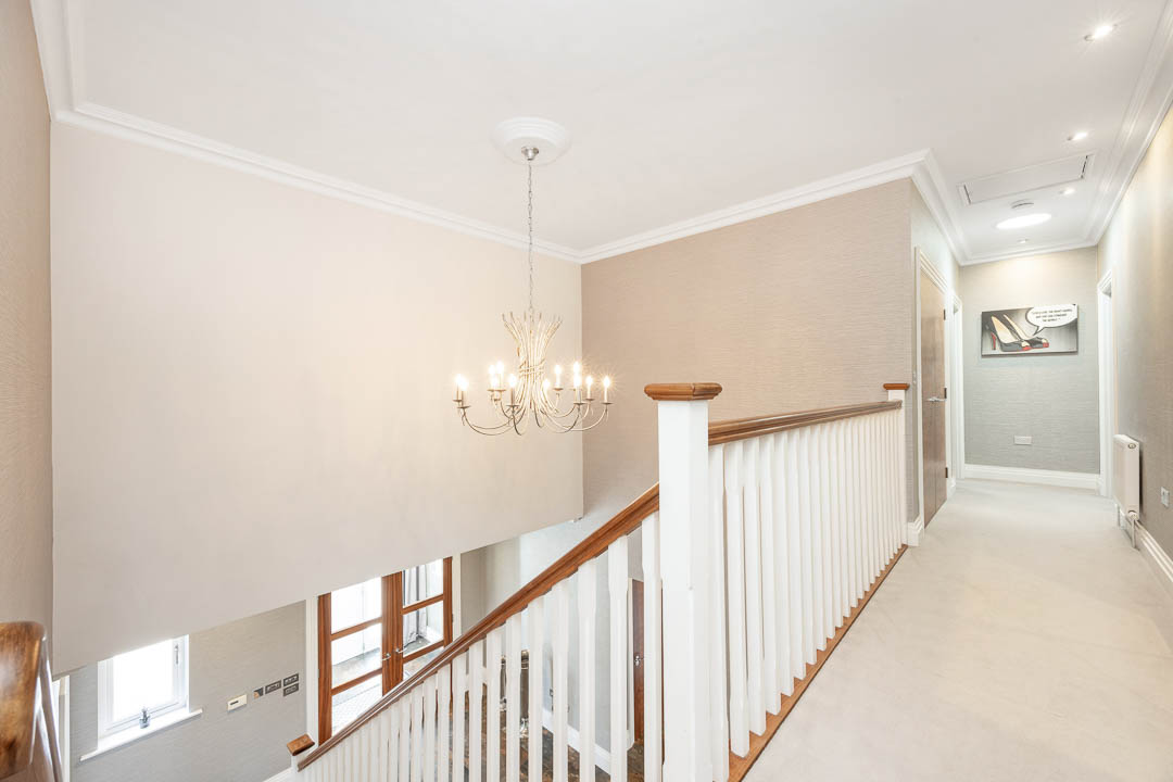 Upon entering the property there is an imposing double-height entrance hall with feature staircase leading to the first floor. A brand newly fitted, superbly appointed and exquisitely finished breakfast-kitchen sets the bar, opening into a family dining room itself linking perfectly back into the entrance hall. The living room is a spacious dual aspect room with a set of French doors leading out to the gardens. There are a further two reception rooms on the ground floor including a study and TV room. On the first floor is a master bedroom suite with a walk-in dressing room and en-suite bathroom, a further four double bedrooms- all with en-suites.