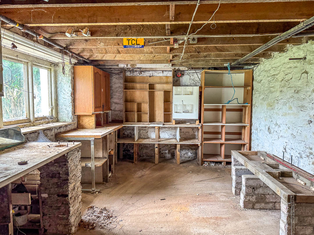 Beneath the house and accessed via the rear garden is a large open workshop space, perfect for storage or a working area. To the back of the property, there is a long and excellently sized rear garden, with a range of mature fruit trees, hedging and fenced borders. The garden is overgrown and would require some additional landscaping.