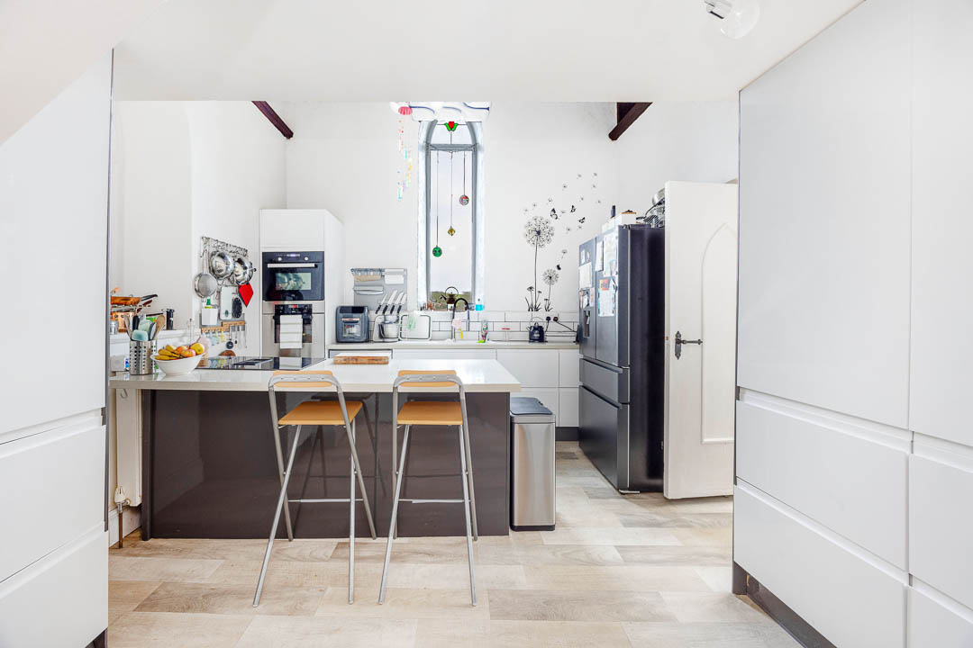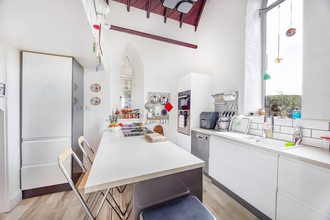 Upon entering the property, there is a gated driveway to the front which has ample space for 3 plus vehicles from which there are steps down to the entrance. The entrance is via a solid wood arched oak door into a spacious vestibule with tiled floors and side window offering plenty of natural light. Off the vestibule, is the ground floor family bathroom suite, which has been finished in keeping with the character of the chapel. From the vestibule a door leads into a large open lounge and dining area. This is a feature room of the chapel with double height vaulted ceilings, original exposed timber beams, two large windows offering plenty of natural lights in addition to the original windows and a set of double glazed doors that lead into the conservatory. The lounge diner has a feature log burner, solid floors and a large recess offering plenty of space for the dining table and chairs. A staircase leads up to a galleried landing, which takes you to bedroom 2. Off the lounge diner, is the conservatory, which has dual aspect uPVC double glazed windows and a set of French patio doors that lead out to the south facing garden. From the conservatory, there is access into the kitchen, which can also be accessed from the living space. The kitchen also has double ceiling heights with stained glass windows and an internal stained glass window offering additional natural light. The kitchen is fitted with a range of wall and base units, large breakfast bar, integrated appliances and ample built in storage.
