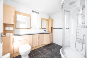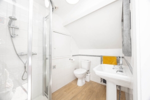 Off the large open-plan family space is a door into a downstairs shower room which has been finished to a modern standard and fitted with a walk in corner shower cubicle, wash hand basin and WC. From the kitchen is access into a side lobby which leads through to the utility room which has space and plumbing for a washing machine and tumble dryer. A double glazed door provides access out to the side garden where the oil tank can be found, there is access from the side courtyard into the double garage.