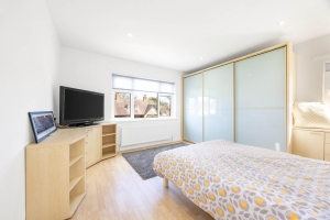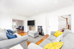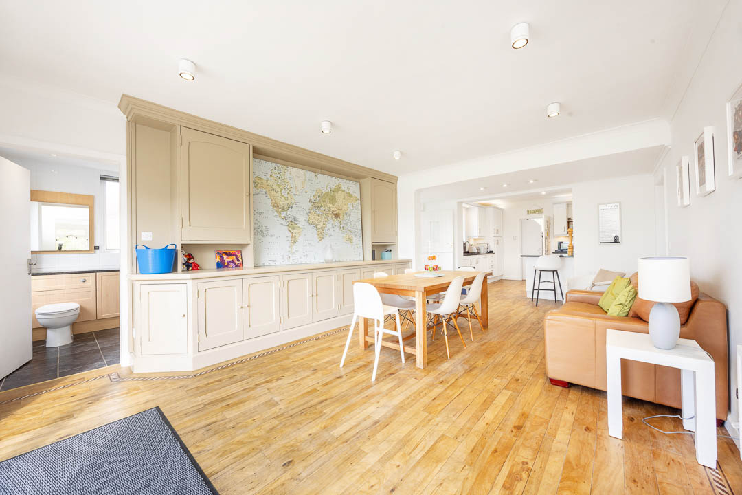 From the sunroom there is an opening which provides access into the large open-plan kitchen/dining/family space, which can also be accessed off the entrance hall. The kitchen is fitted with a range of modern white wall and base units with integrated appliances and a breakfast bar. The kitchen opens into the living space which benefits from a set of large sliding patio doors to the rear which give access out onto the garden. There is a built in Welsh dresser storage cupboard which is in keeping with the properties era.
