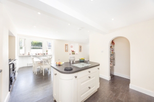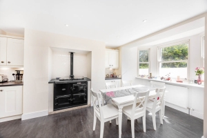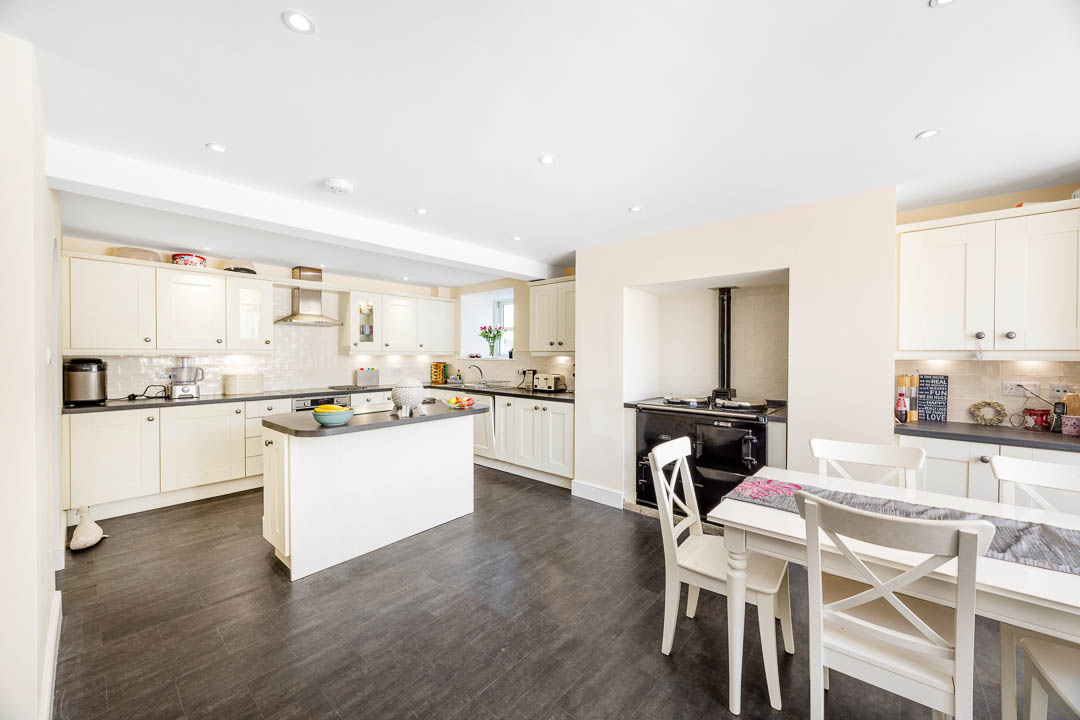 Taking the stairs down to the lower ground floor off the half landing, is access into a good size utility room, which has a door giving access to the rear of the property. There are a range of units, wash hand basin, sink and a double glazed window offering plenty of natural light. Off the utility room is access into the boiler room which houses the oil fired central heating boiler and pressurised hot water cylinder. Continuing down to the lower floor into a big open plan space, the kitchen area is fitted with a range of contemporary style wall and base unit units with a matching island, integrated appliances, AGA and dual aspect windows, the larger of which being situated to the front of the property. There is ample space for a good sized dining table, the dining area opens round to the family room which offers additional living space again with dual aspect double glazed windows.