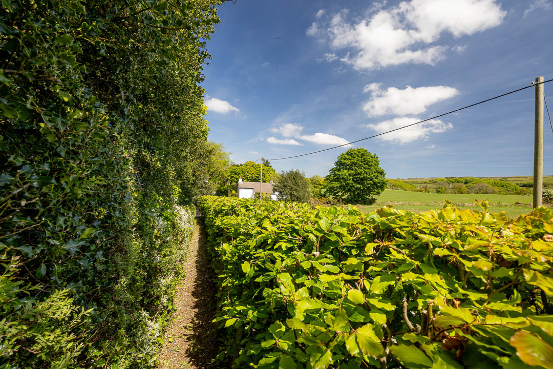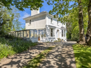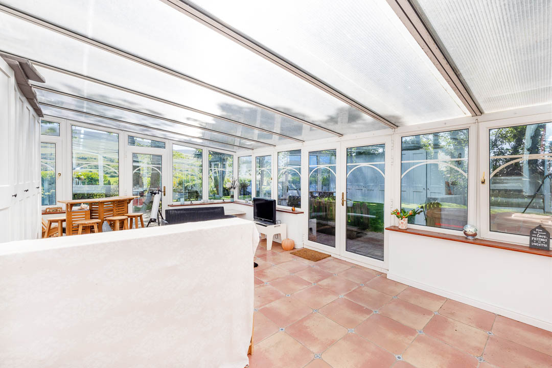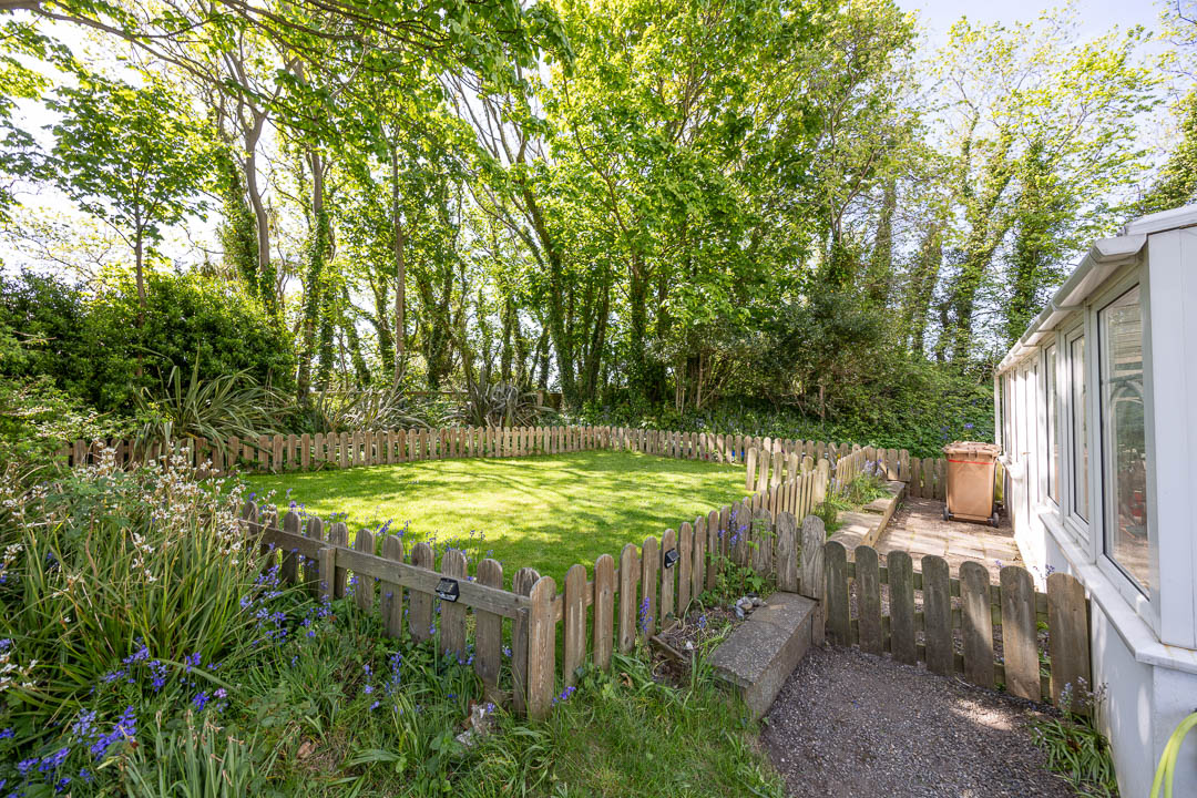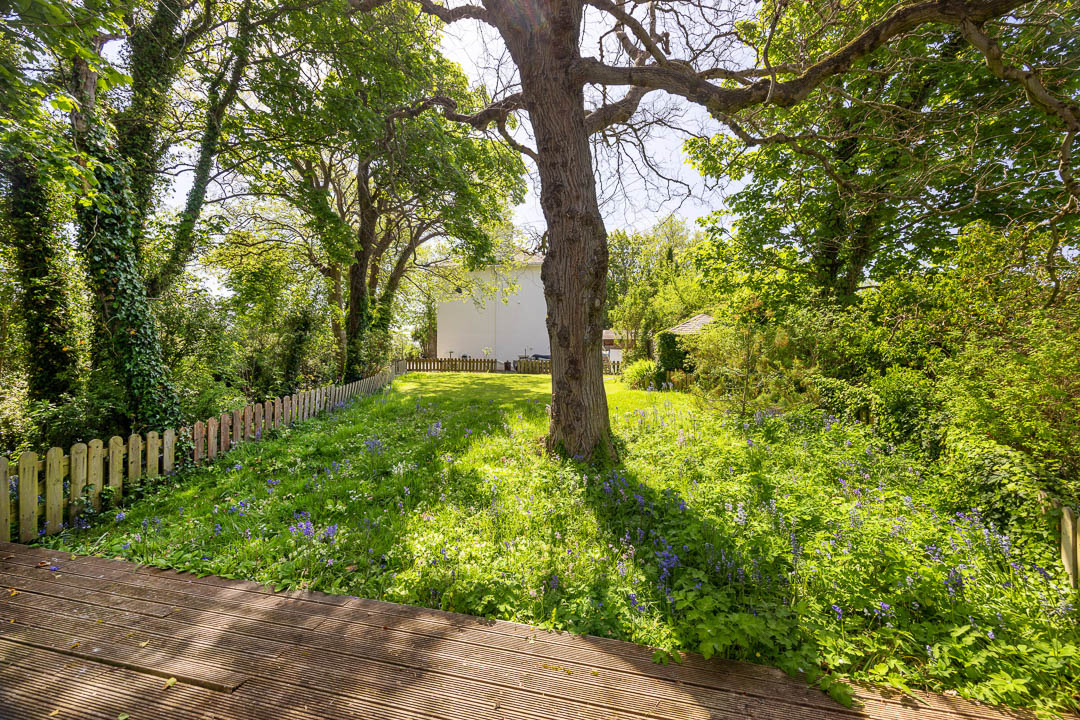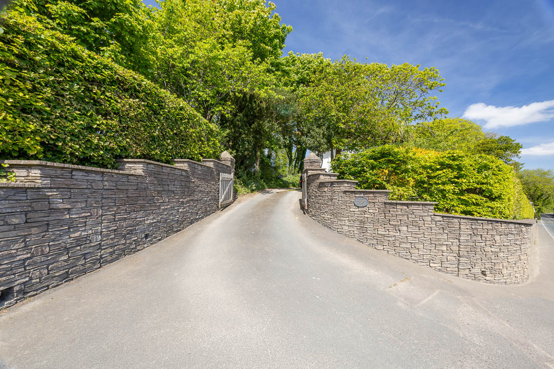 In addition to the house there is a gravelled driveway which provides off road parking for six or seven vehicles to the front of the property. There’s a large mature Beach hedge offering total privacy with a stone clad wall from the roadside. Either end of the house there are two lawned areas, the larger lawned area feeds down to lower deck and entertainment space with a picket fence. A wooden shed, wooded footpaths meander through the grounds and to an additional lawned area on the conservatory side of the house.