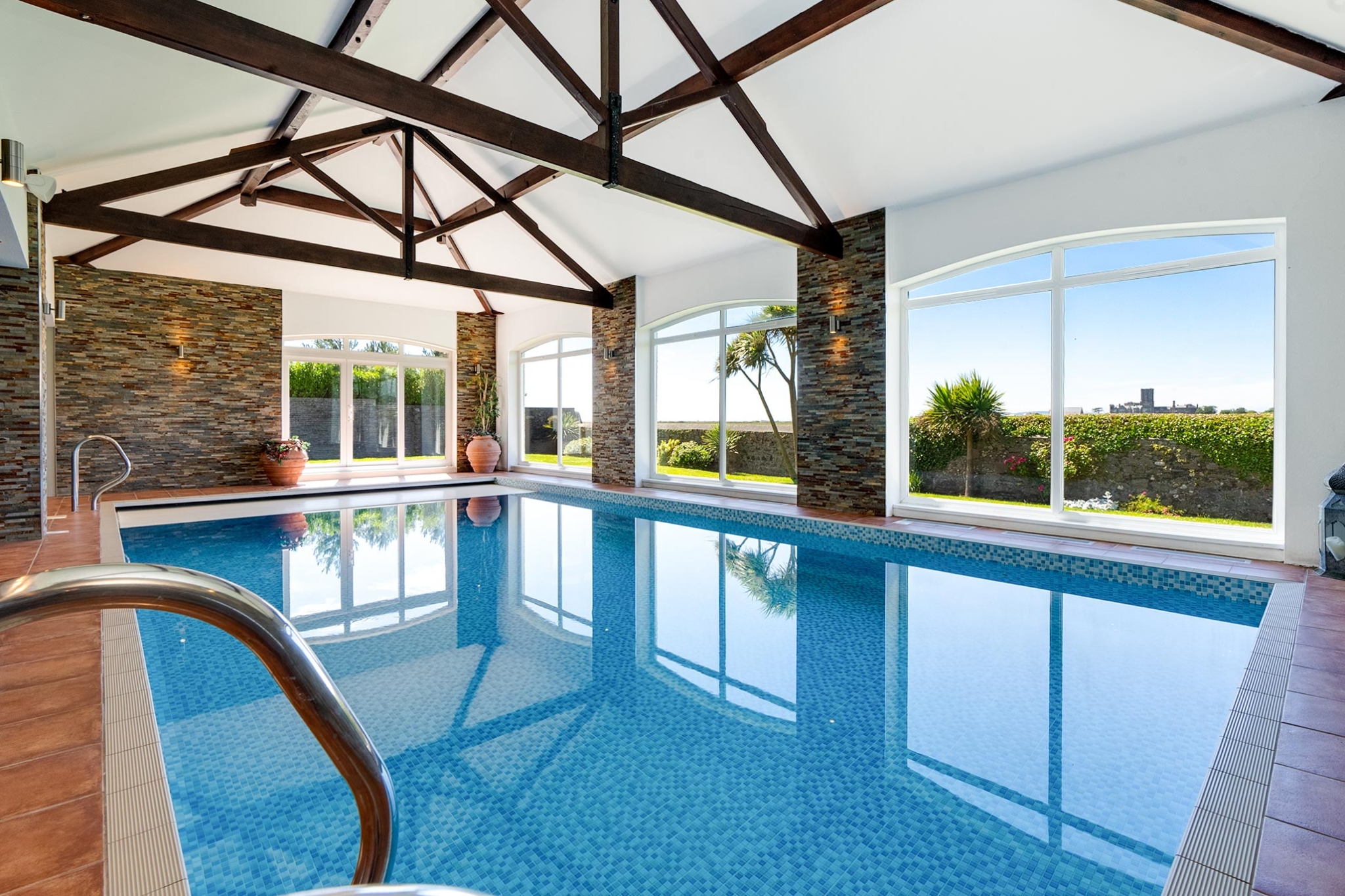 An impressive swimming pool and gym complex adds to the properties luxury, complemented by relaxation areas and two changing/shower rooms. This area is perfect for both fitness and leisure, providing a private oasis within your own home. The complex features a heated indoor pool complemented by solar panels, and serene lounging spaces, making it a haven for health and wellness.