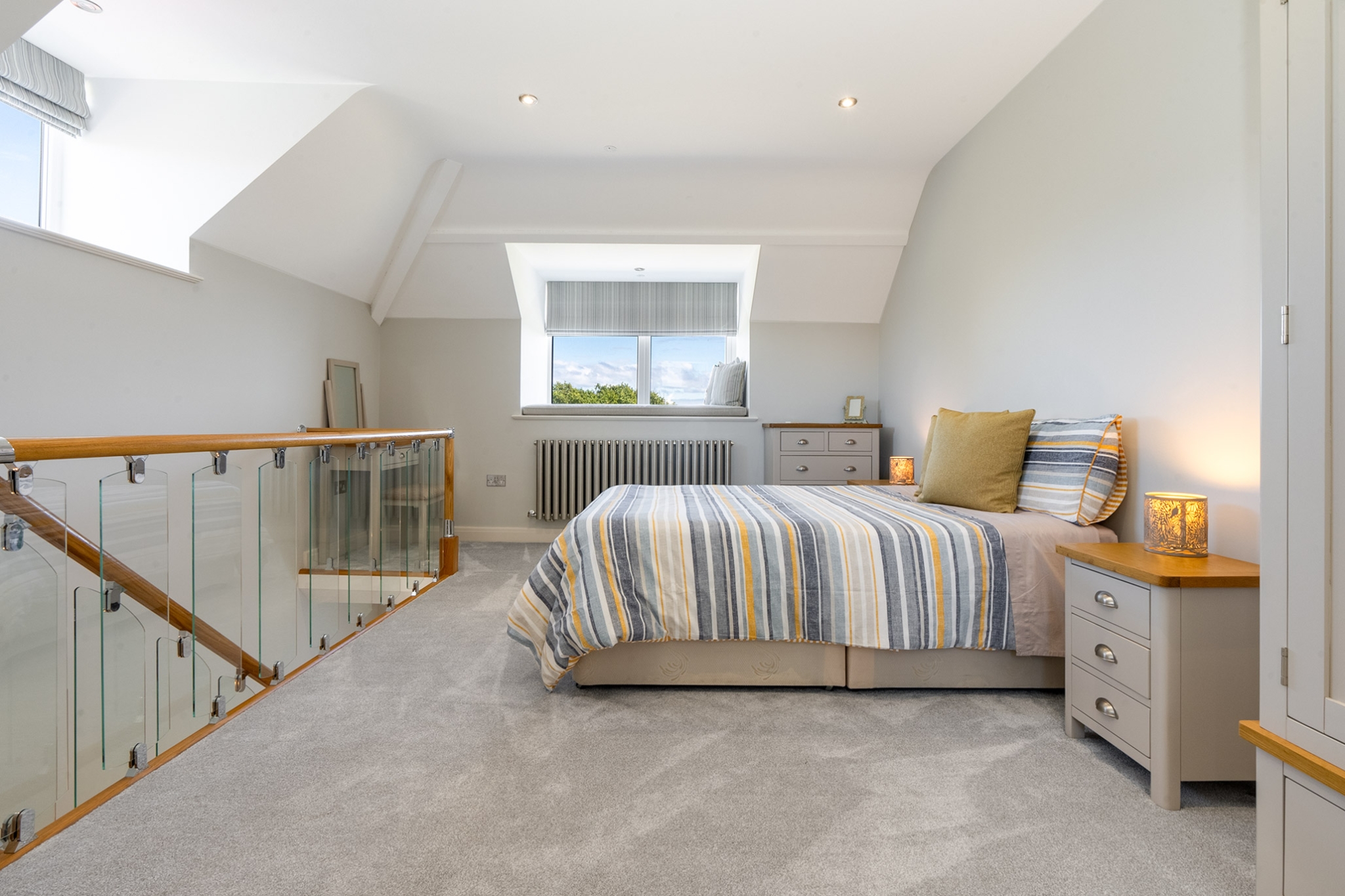 The principal bedroom suite is a true retreat, featuring a walk-in wardrobe, a dressing room, an en-suite bathroom, and access to a large sun terrace where you can enjoy the stunning views towards Castletown. This serene sanctuary is designed with relaxation in mind. There are four further double bedrooms, a shower room, a family bathroom, and a first-floor study that can also serve as a sixth bedroom, ensuring plenty of space for a growing family or guests.