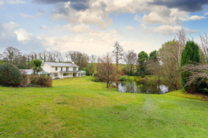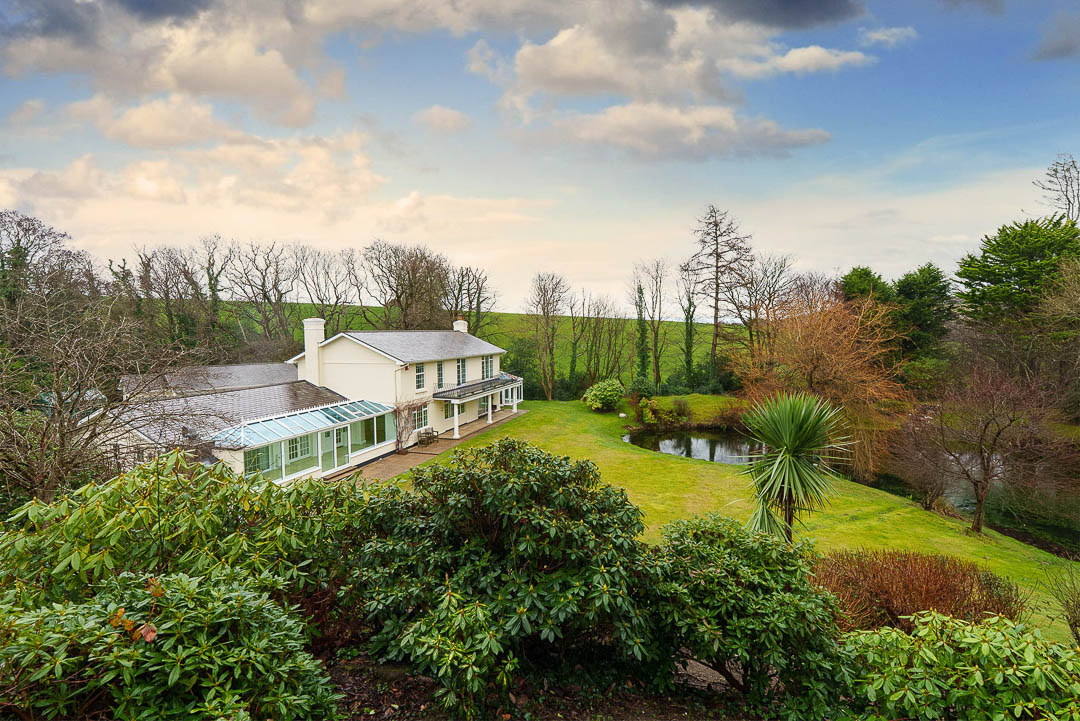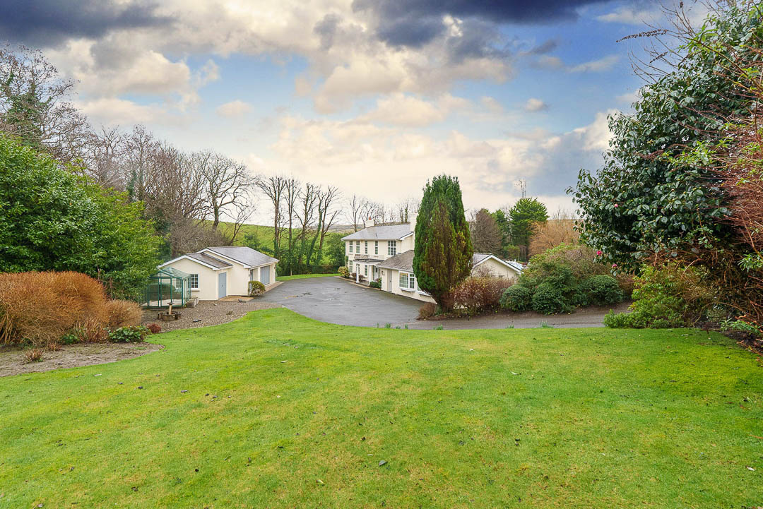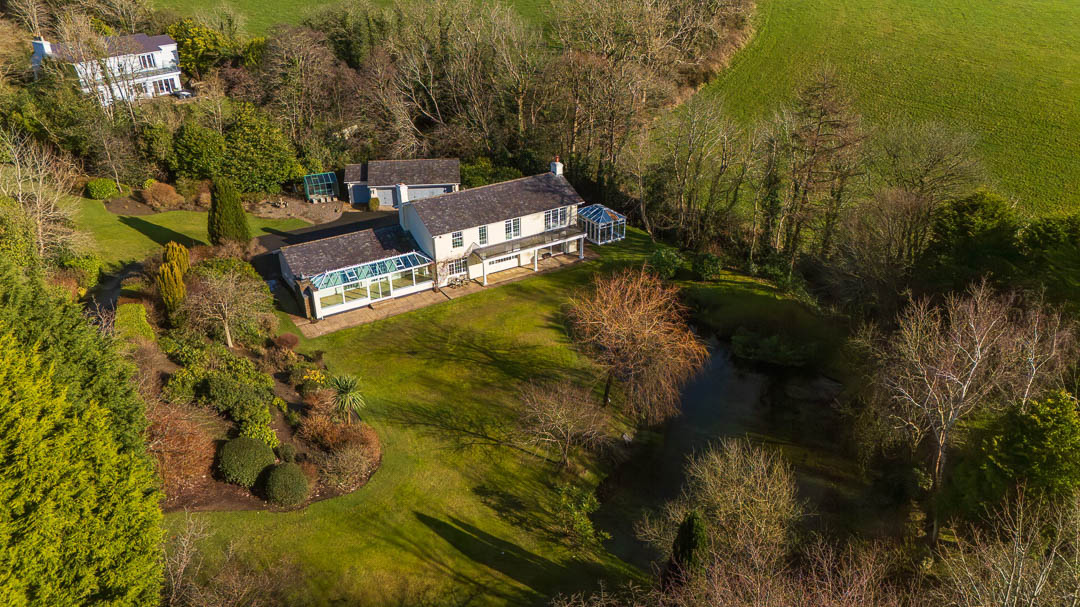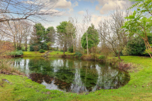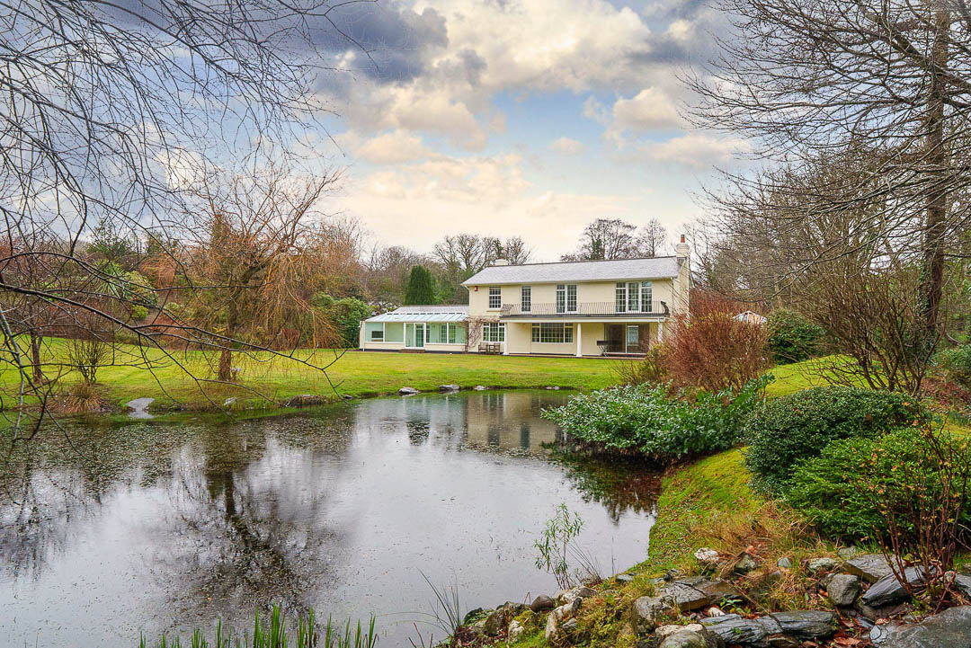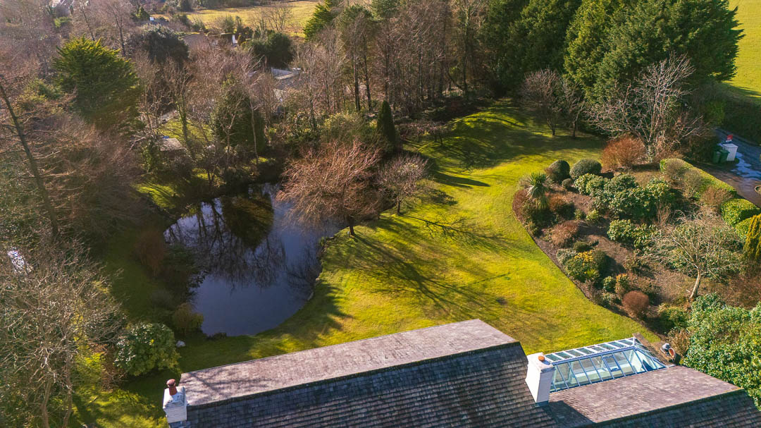 Outside, the gardens are attractively landscaped with mature trees, lawns, a pond and a stream. Additional features include a detached triple garage with adjacent store room, greenhouse, and a separate uPVC garden room currently housing a hot tub.