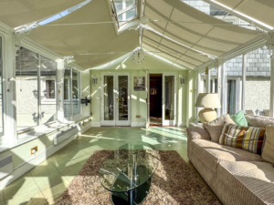 Upon entering the main house, there is a spacious entrance hall which leads into a large open-plan kitchen and dining area with an adjoining utility room and boot room. A bright, triple aspect, living room features a fireplace and large picture windows provide plenty of natural light and views over the grounds. The formal dining room, accessible from the entrance hall and lounge, with two sets of double doors leading into the conservatory. A home office and good-sized dual aspect bedroom, with en-suite bathroom.