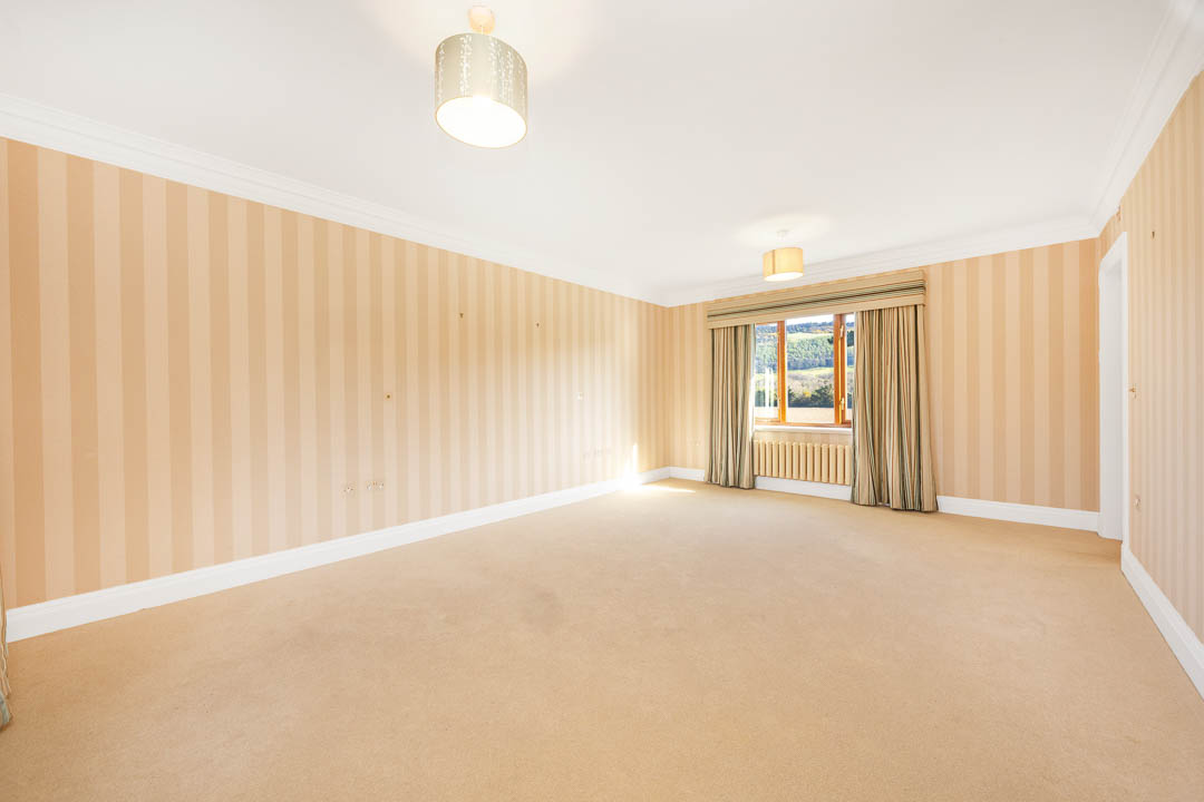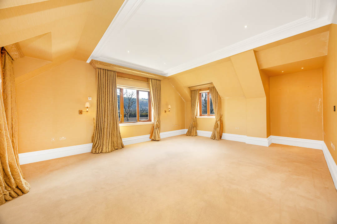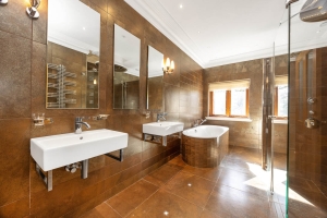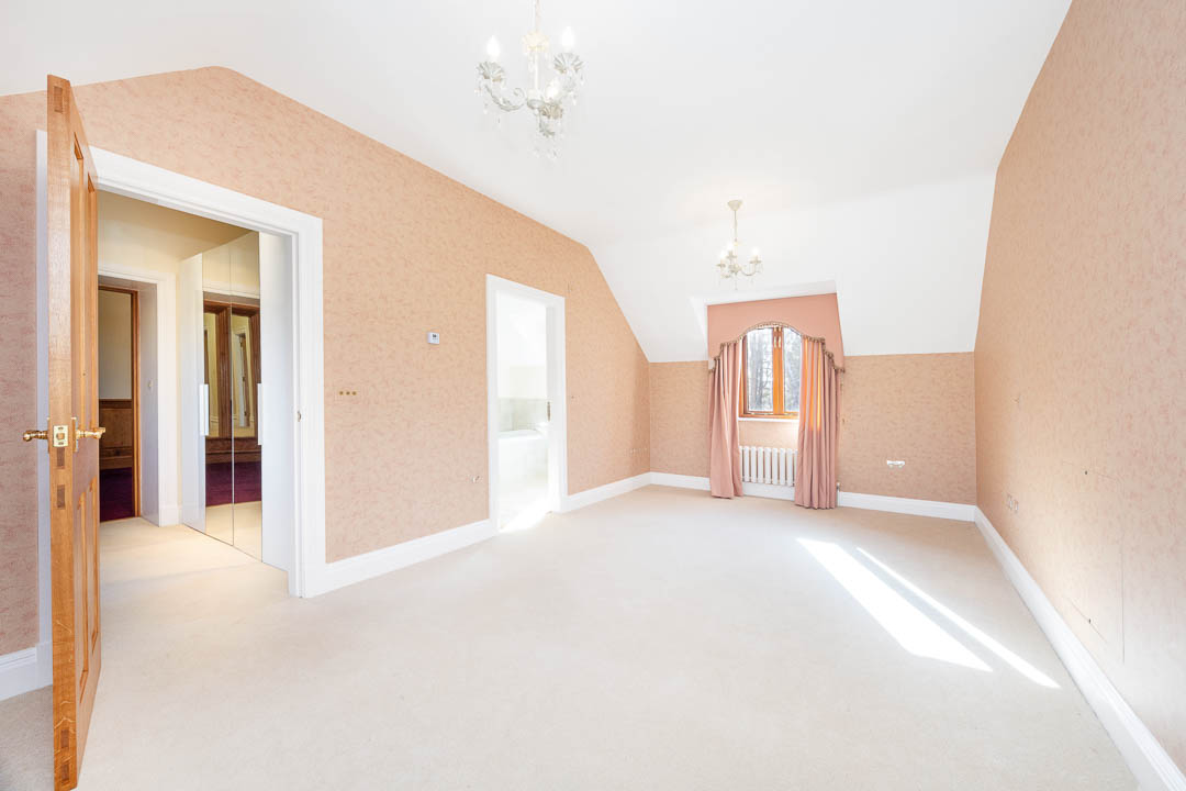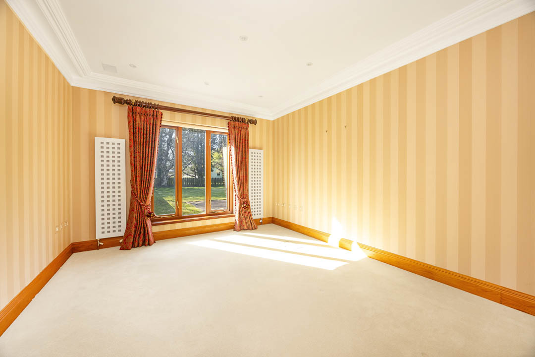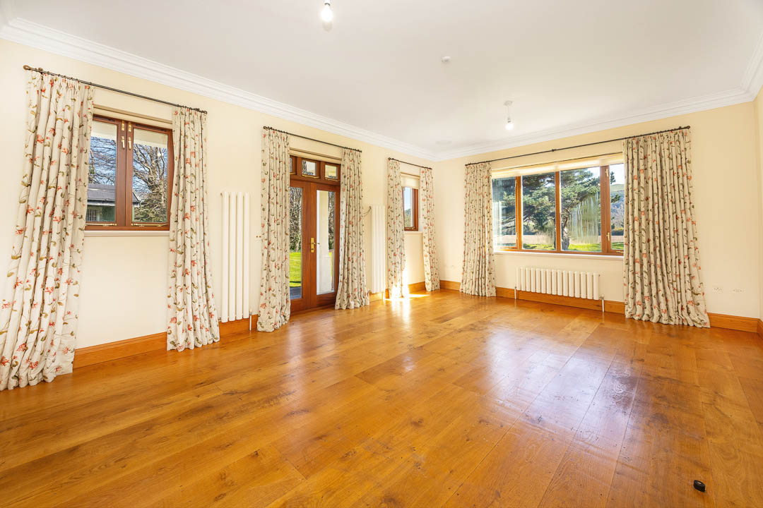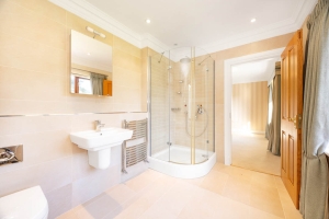 Off the main hall is bedroom 4, a dual aspect double bedroom with an en-suite bathroom which is fitted with a three piece suite comprising of a tiled bath, wash hand basin set on hardwood cabinetry, WC and wet room area with Hansgrohe ‘deluge’ shower and hand spray, fully tiled walls and floor. Taking the stairs to the first floor, there is a large landing with oak panelled walls, large linen storage with twin Megaflow water cylinders and loft access. Off the landing is the master bedroom suite with dedicated zoned lighting, Ante room with fabric padded walls, sensor-activated lighting and custom made wardrobes. Leading through into the bedroom which is a generous triple aspect room with attractive rural views. The en-suite bathroom is appointed with a luxurious suite comprising twin Villeroy and Boch wash hand basin, WC and bidet. Villeroy and Boch fire and ice tiled walls and floor, matching tiled bath, glass enclosed wet room with ‘Rain Dance’ variable jet deluge shower head, built in cabinets and floor lighting. The master bedroom suite also benefits from a dressing room which is fully lined with cupboards, drawer, open shelving and hanging space, sensor activated lighting and door to balcony. Bedroom 2 is a spacious dual aspect double room with a dressing room with fitted wardrobes and an en-suite bathroom fitted with a four piece suite comprising tiled bath, glass corner shower enclosure with deluge shower head and hand spray, Villeroy and Boch wash hand basin and WC. Fully tiled walls and floor. Bedroom 3 is another great size bedroom with a dressing room fitted with a range of wardrobes and an en-suite bathroom fitted with a four piece suite comprising tiled bath, glass shower enclosure with deluge shower head, wash hand basin and WC, half tiled walls and tiled floor.