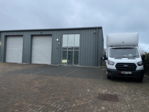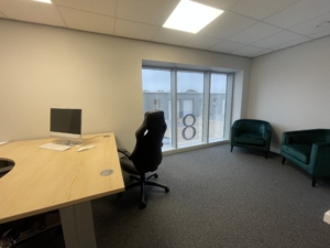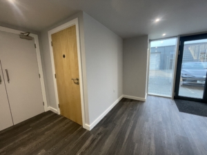 Ground Floor Front – Glazed doors into entrance lobby, kitchen/breakout room & WC and warehouse.